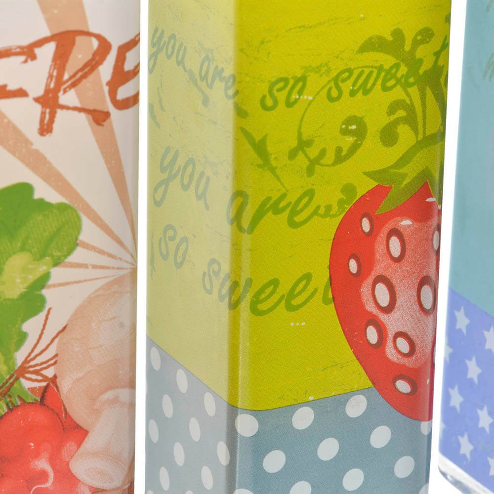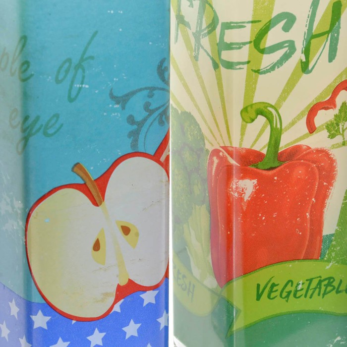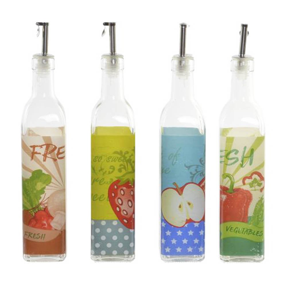 La aceitera de vidrio transparente tiene capacidad para 500 ml de aceite o vinagre, decorada con una impresión a color de frutas u hortalizas para dar un toque de color y alegría a la cocina, 4 modelos.