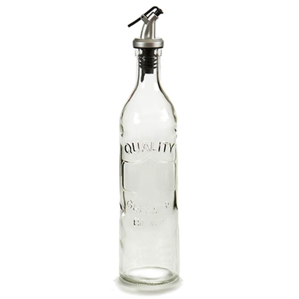 Aceitera de cristal transparente con 500 ml de capacidad en forma de botella redonda y alargada con un diseño sencillo en relieve, cuenta con un tapón de acero inoxidable con junta de silicona para un ajuste perfecto.