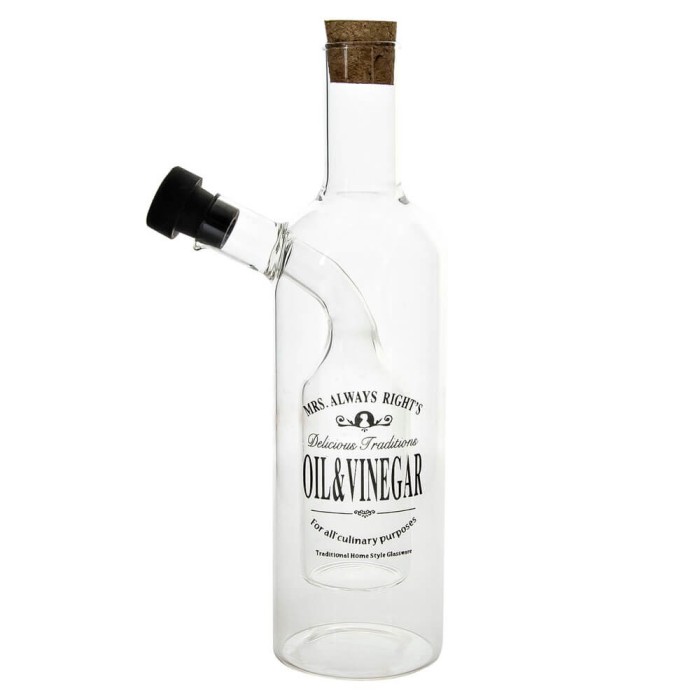 En la aceitera de cristal puedes almacenar y dispensar ambos líquidos sin que se mezclen creando un fantástico efecto visual, ademas, su diseño transparente te permite ver en todo momento el contenido restante para que no te quedes nunca sin aceite ni vinagre.