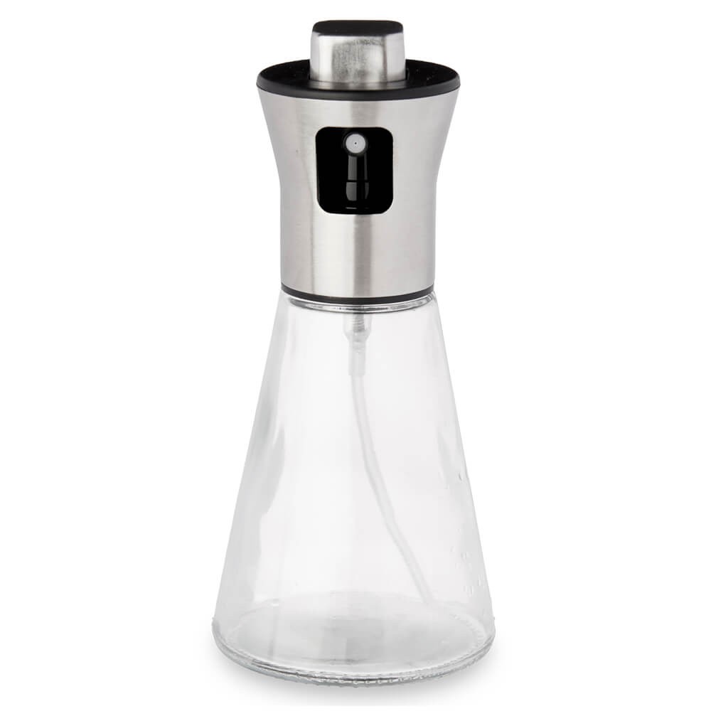 Aceitera de vidrio transparente con tapón pulverizador metálico. Perfecta para controlar el consumo de aceite en tus platos. Diseño práctico y elegante con 200ml de capacidad.