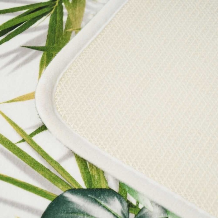 Alfombra de baño Modelo Palm Green confeccionada en tejido de microfibra absorbente de tacto suave y agradable de 220 gramos/m2, diseño en color blanco con una bonita impresión en la superficie de hojas tropicales, Monstera y Palma.