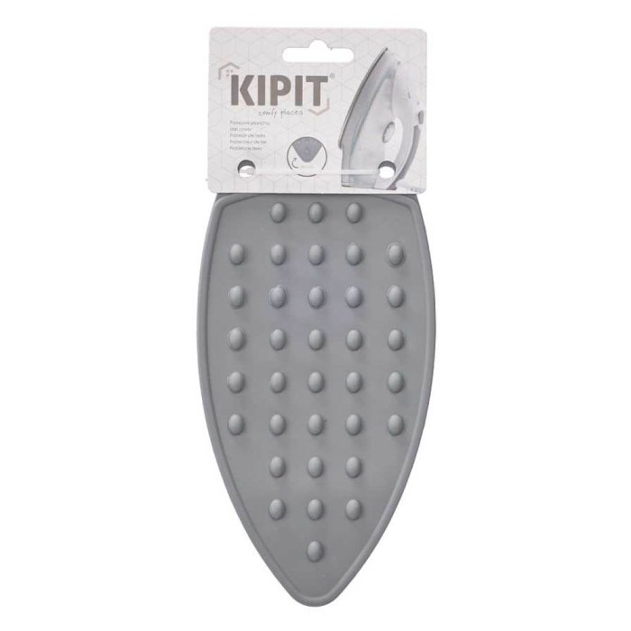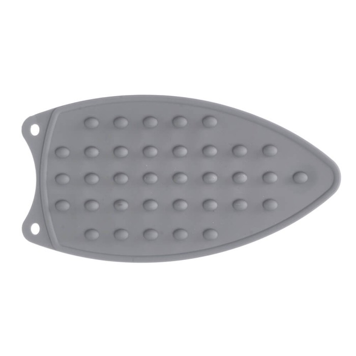 Protector de plancha de silicona gris para proteger superficies del calor de la plancha. Medidas: 26,5 x 14 x 0,5 cm. Resistente al calor, antideslizante y fácil de limpiar.
