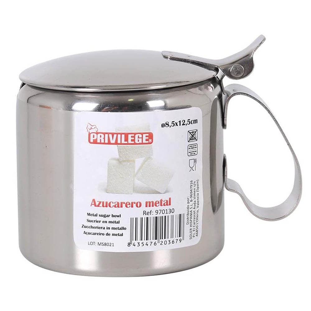 Azucarero con tapa y asa realizado en metal, adecuado para uso domestico y para hostelería. El azucarero tiene un diseño sencillo, fácilmente combinable con otras piezas. Es un accesorio funcional, muy útil para llevar y servir el azúcar en la mesa. Perfecto para endulzar las bebidas.