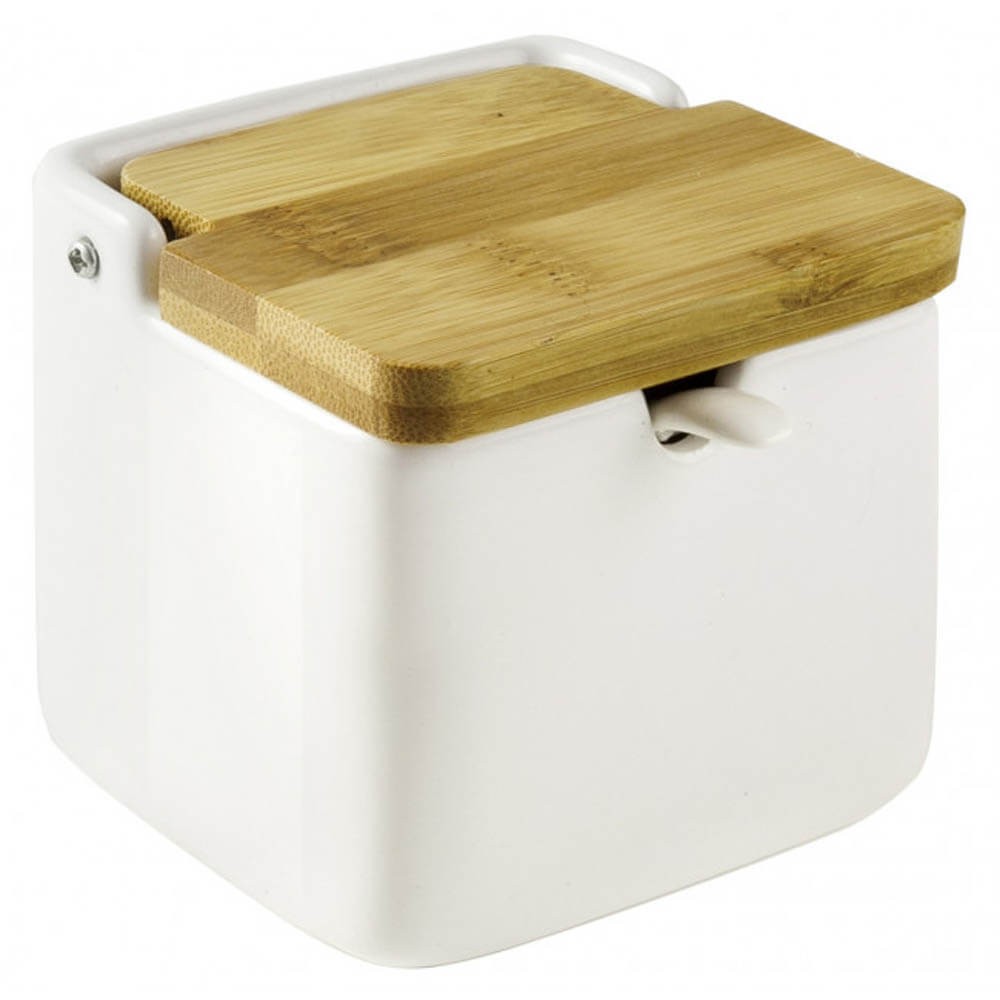 Azucarero blanco de cerámica con tapa de bambú, incluye cucharilla.