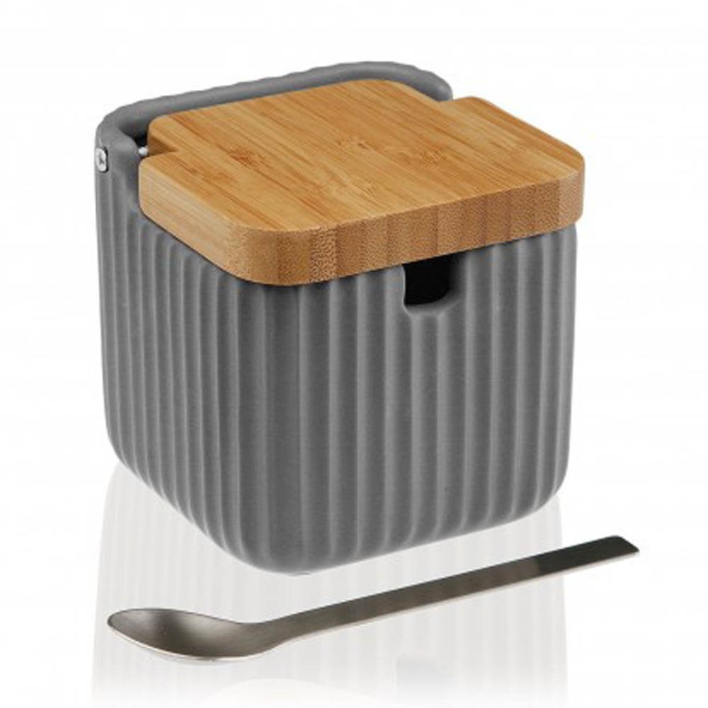 Azucarero diseño acanalado realizado en cerámica con tapa de bambú. Incluye cucharilla metálica.