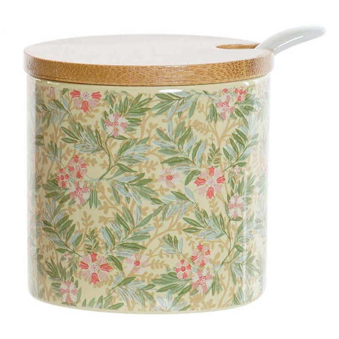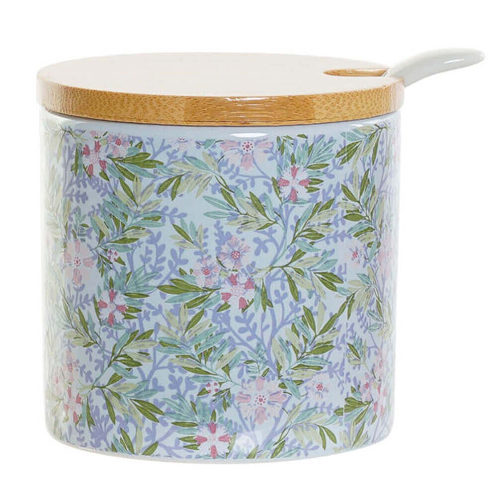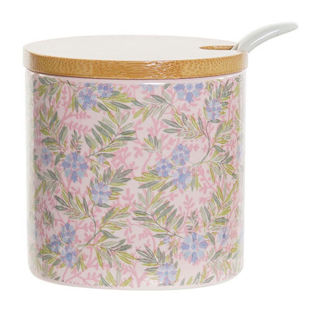 Azucarero de mesa redondo con tapa extraíble de bambú y cucharilla blanca, realizado en cerámica dolomite con un bonito diseño floral en color rosa, azul o verde.
