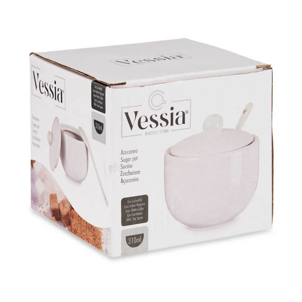 Un azucarero de mesa con un diseño sencillo y elegante para que puedas combinarlo fácilmente con otros accesorios, incluye tapa y cuchara de cerámica blanca.