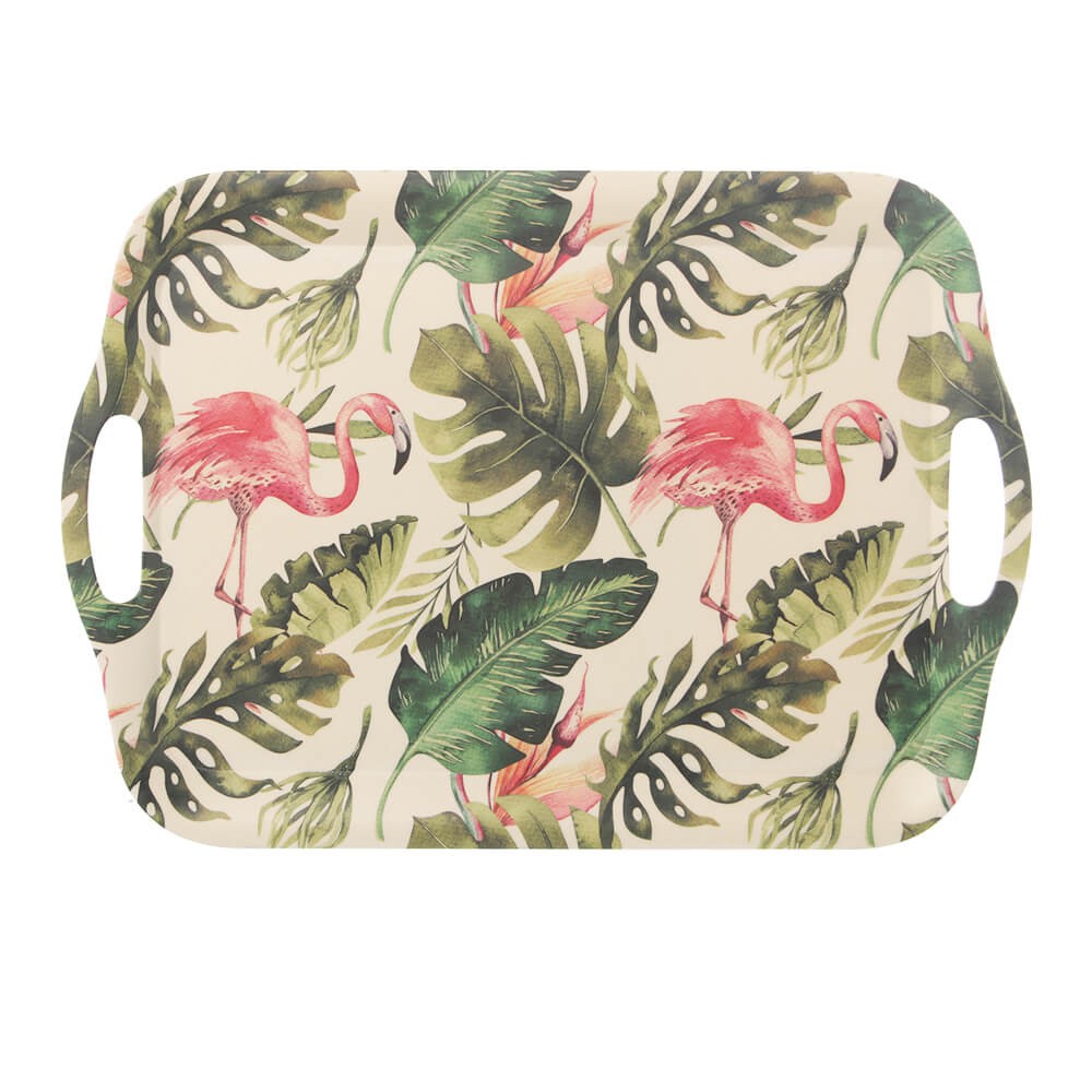 Una bandeja de estilo tropical realizada en fibra de bambú resistente con la superficie decorada con una bonita impresión de flamencos y hojas que aportará color y alegría a la cocina.