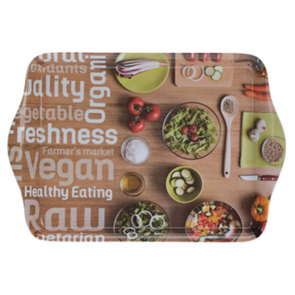 Mini bandeja de cocina con la superficie impresa con un atractivo decorado de alimentos realizada en melamina resistente con dos prácticas asas para que transportes cómodamente el contenido, ideal para servir café o té o llevar aperitivos a la mesa.