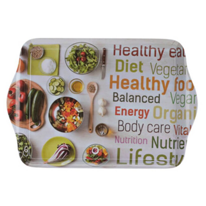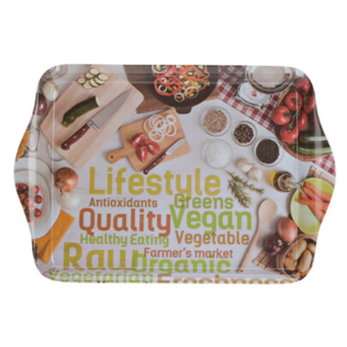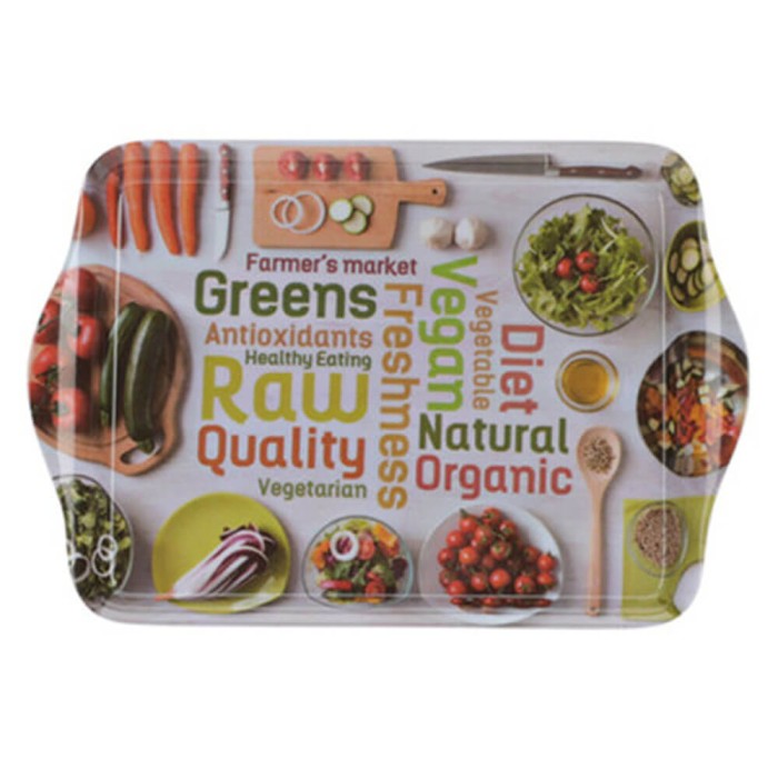 Si eres amante de la comida y la cocina, esta bandeja es para ti. La bandeja de melamina presenta un atractivo diseño de alimentos impresos a todo color. Puedes elegir entre cuatro decorados diferentes de verduras y hortalizas. ¿Qué mejor manera de comenzar tu día que con un toque de sabor visual?