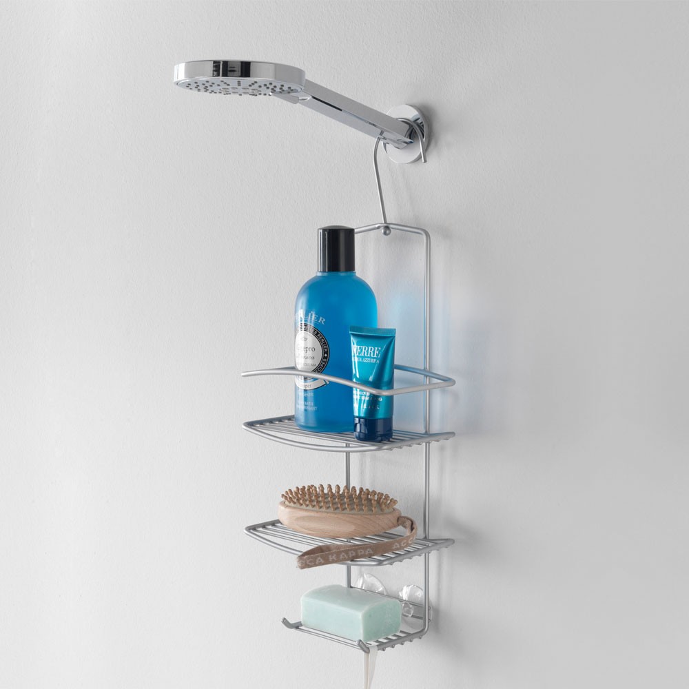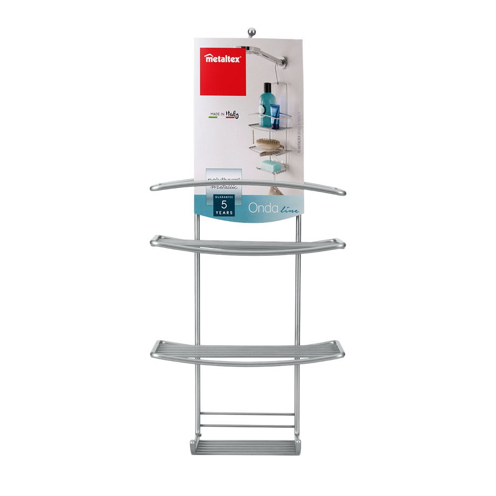 Accesorio para baño con una linea sencilla, limpia y sinuosa con 3 baldas para colocar el gel y champú, la esponja y la pastilla de jabón. La estantería para baño esta fabricada en alambre robusto con un revestimiento plastificado en Polytherm®: el doble tratamiento de superficie exclusivo de Metaltex, que da un aspecto metálico y protege al producto de la oxidación y suciedad. Fácil de colocar gracias a su sistema con percha para colgar de la barra de la ducha. Esta estantería de baño sin taladro se puede mover fácilmente de un sitio a otro, es el complemento perfecto para tener a mano en la ducha y organizados los productos de higiene personal.
