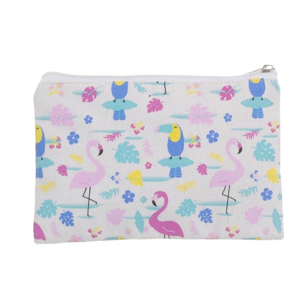 Neceser en tela de algodón y poliéster decorado con flamencos y pelicanos, cierre de cremallera. Ideal para meter maquillaje y accesorios de belleza.
