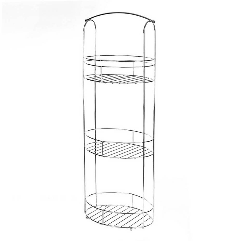 Estantería ovalada de metal cromado con tres prácticas baldas para colocar los jabones y accesorios de belleza en el baño. Mueble auxiliar super útil para tener a mano y ordenados en la ducha o bañera los geles y jabones. Su asa permite que puedas moverla cómodamente. Se le puede dar otros usos como para ordenar los jabones de limpieza, bayetas, etc.
