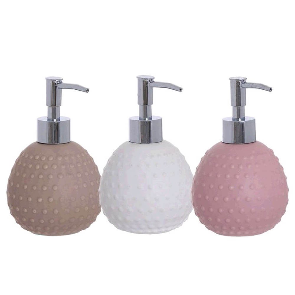 Dosificador de jabón líquido para el baño con forma de bola, perfecto para colocarlo al lado del lavabo para mantener una higiene correcta de nuestras manos. Gracias a su diseño será un elemento de decoración para el cuarto de baño que podrás elegir entre tres colores rosa, blanco o topo. El jabón se extrae fácilmente, tan solo tendrás que presionar el cabezal. Se recomienda limpiar con un paño húmedo.