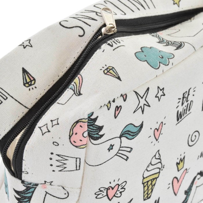 Práctico neceser de viaje en color blanco decorado con dibujos de unicornios, arco-iris, estrellas, corazones, helados, etc. Confeccionado en tela resistente con cierre de cremallera, este neceser tiene un diseño original y divertido, es muy útil para llevar el maquillaje en el bolso, los artículos de belleza e higiene personal, como bolsa para guardar pequeñas cremas de bebé o para que los niños lleven el peine y la colonia al cole.