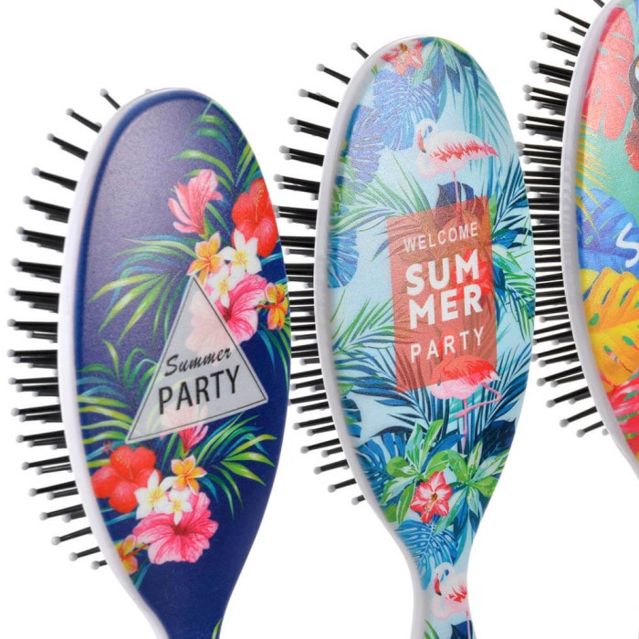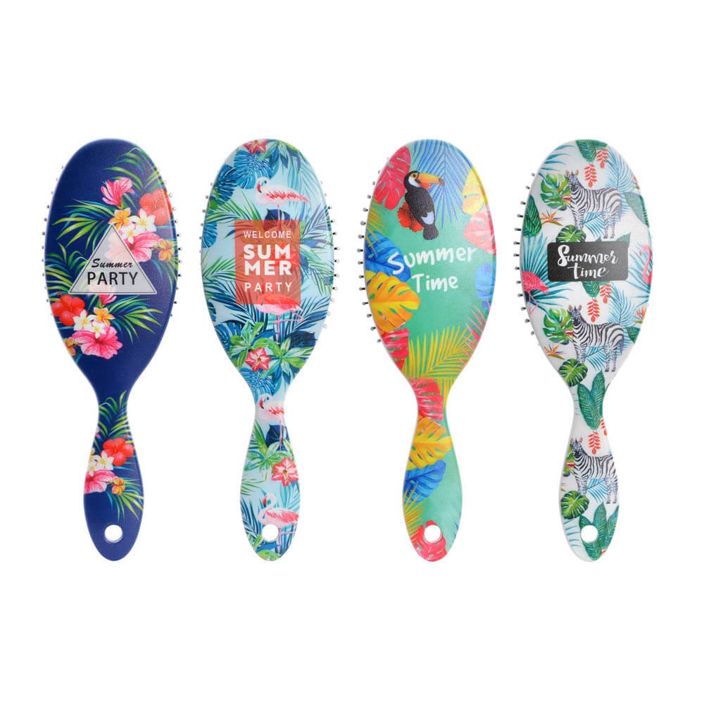 Cepillo para el pelo de uso diario con cabezal ovalado, mango largo y cómodo para conseguir un buen cepillado y púas plásticas con puntas redondeadas para desenredar cualquier tipo de pelo. El cepillo esta realizado en polipropileno resistente, decorado con un impresión original de hojas y animales tropicales. Hay 4 diseños surtidos, cebra, pelicano, flamenco y flores.