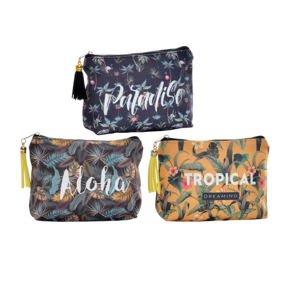 Neceser de viaje confeccionado en tela de poliéster resistente con cierre de cremallera, disponible en 3 decorados de estilo tropical, "Paradise, Aloha o Tropical dreams". El neceser tiene un diseño fresco y colorido, es muy útil para llevar el maquillaje en el bolso, artículos de belleza e higiene personal o cómo bolsa para guardar pequeñas cremas de bebé o las cremas de la playa.