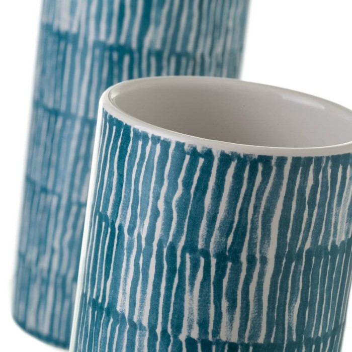 Juego de dos accesorios de baño realizados en cerámica resistente con un diseño moderno de líneas verticales en color azul y blanco. El juego esta compuesto por un dosificador de jabón manual para encimera y un vaso portacepillos de dientes sin tapa.