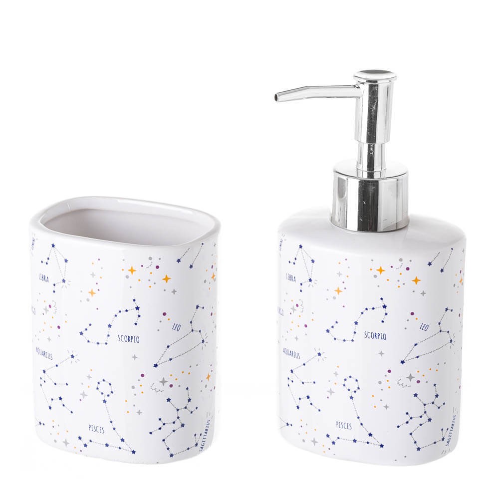 Juego de dos accesorios de baño realizados en cerámica resistente con un diseño moderno de constelaciones en color blanco con estrellas de colores. El juego esta compuesto por un dosificador de jabón manual para encimera y un vaso portacepillos de dientes sin tapa.