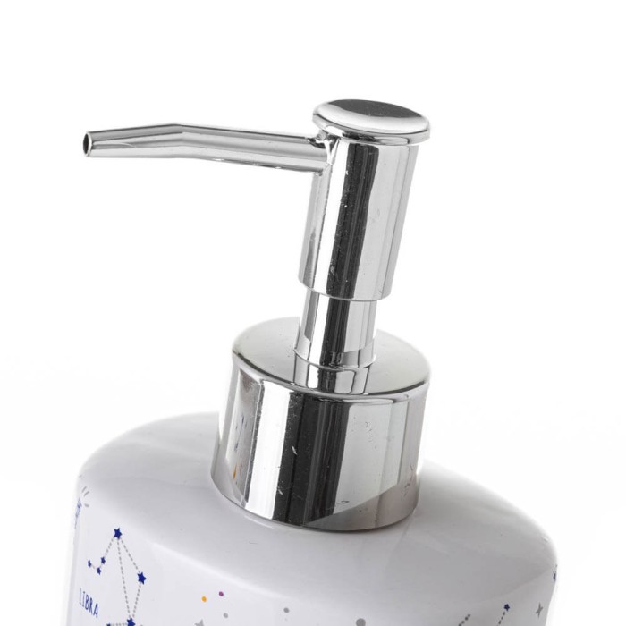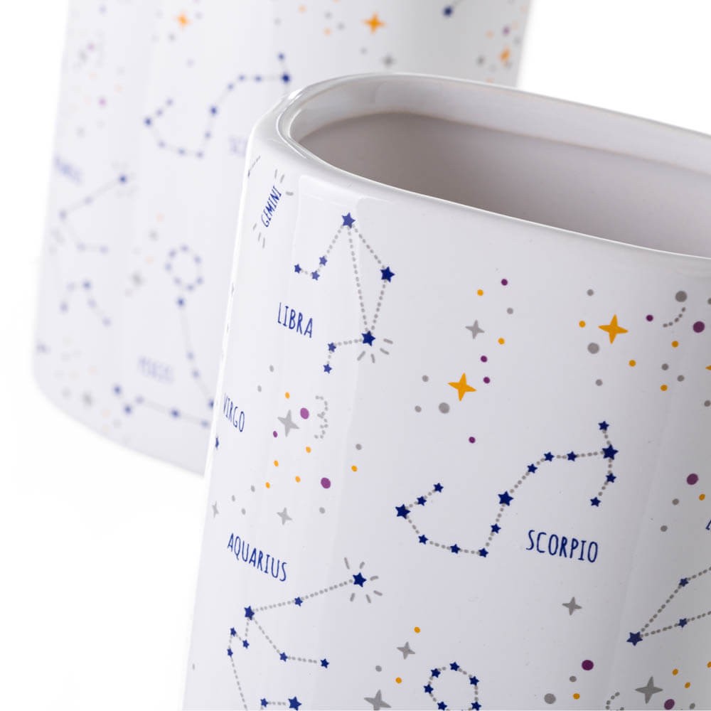 Juego de baño compuesto por un dosificador de jabón y un portacepillos de dientes en cerámica decorada con constelaciones.