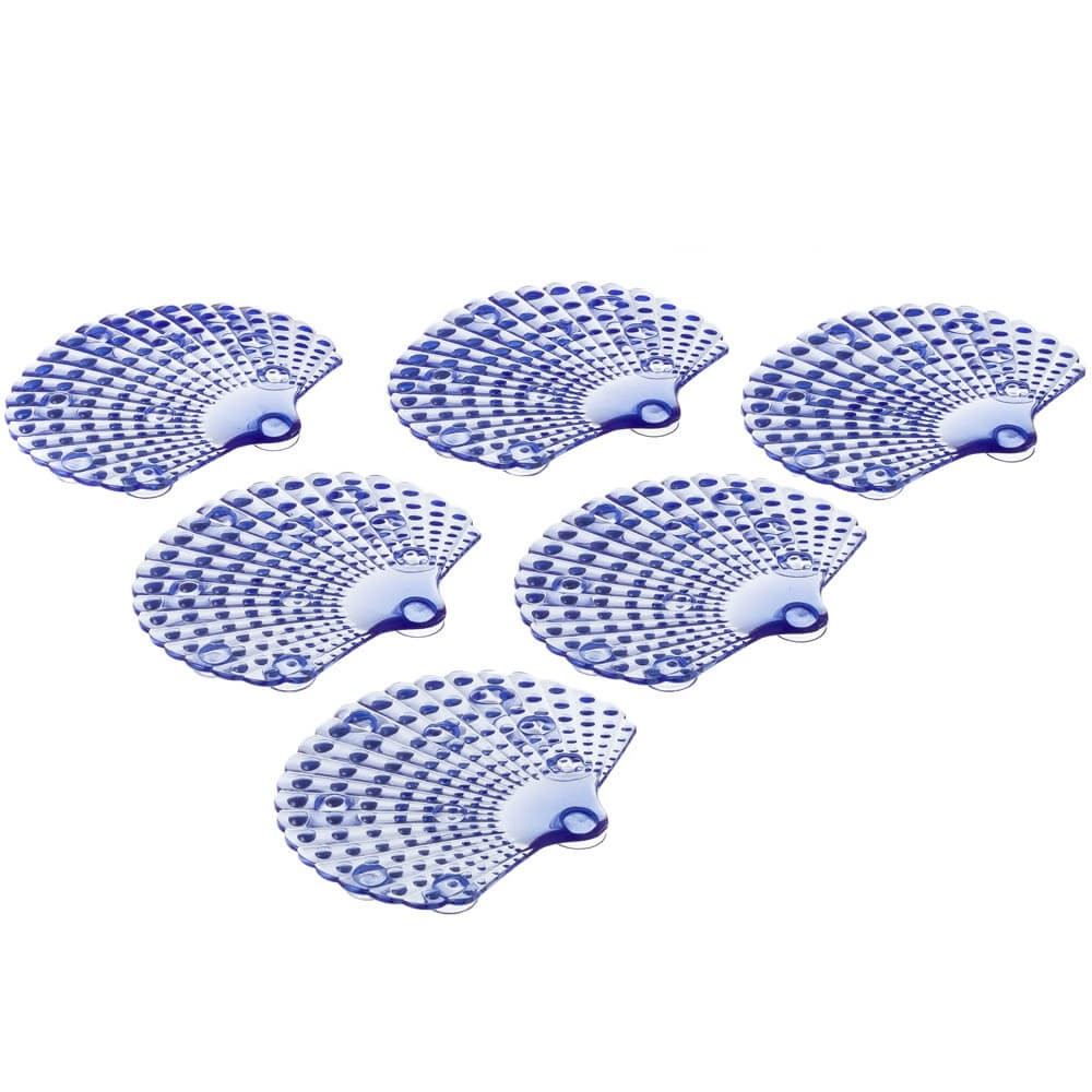 Set de 6 antideslizantes para bañera o ducha realizados en PVC con forma de concha. Accesorio funcional y decorativo para prevenir peligrosos resbalones, se adhieren al fondo de la bañera gracias a sus ventosas.