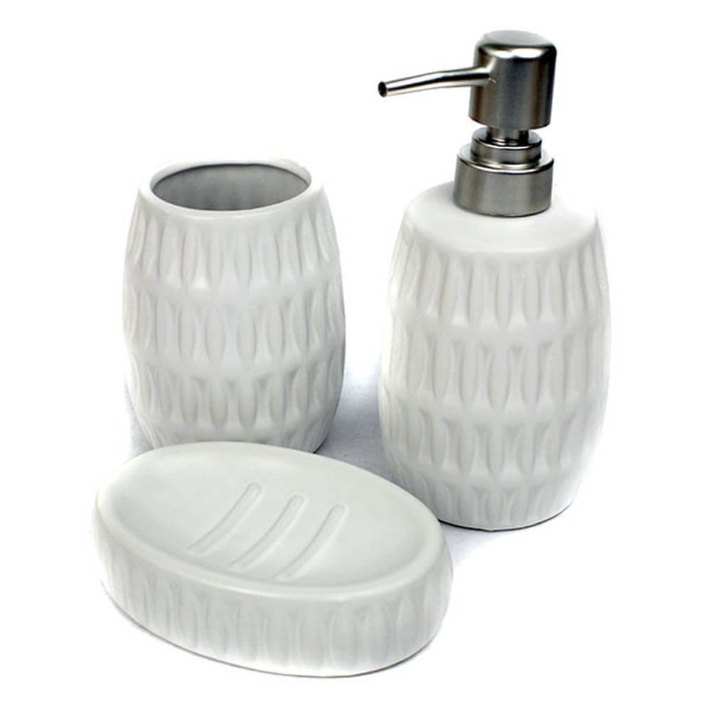 Juego de baño compuesto por tres accesorios de baño en cerámica blanca.
