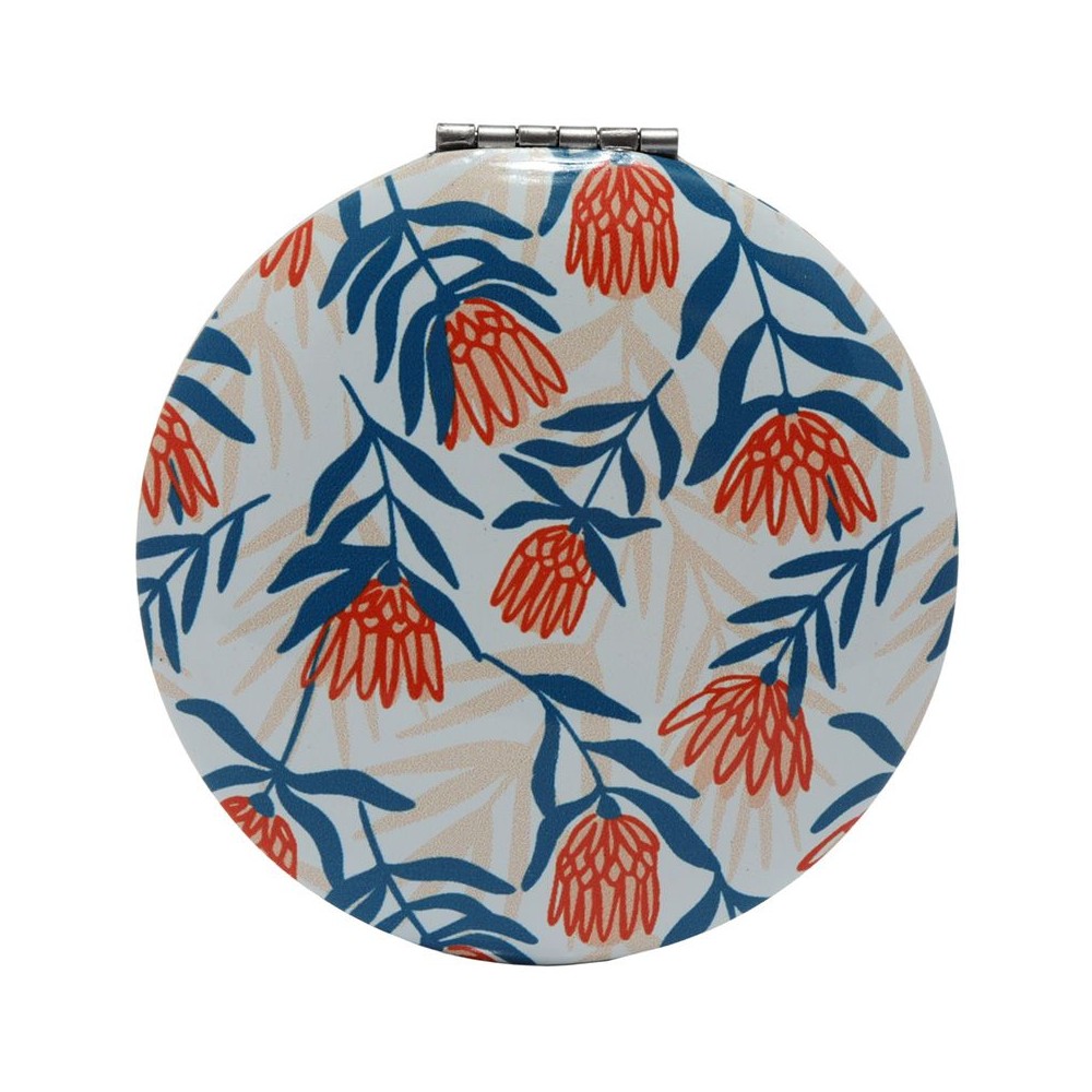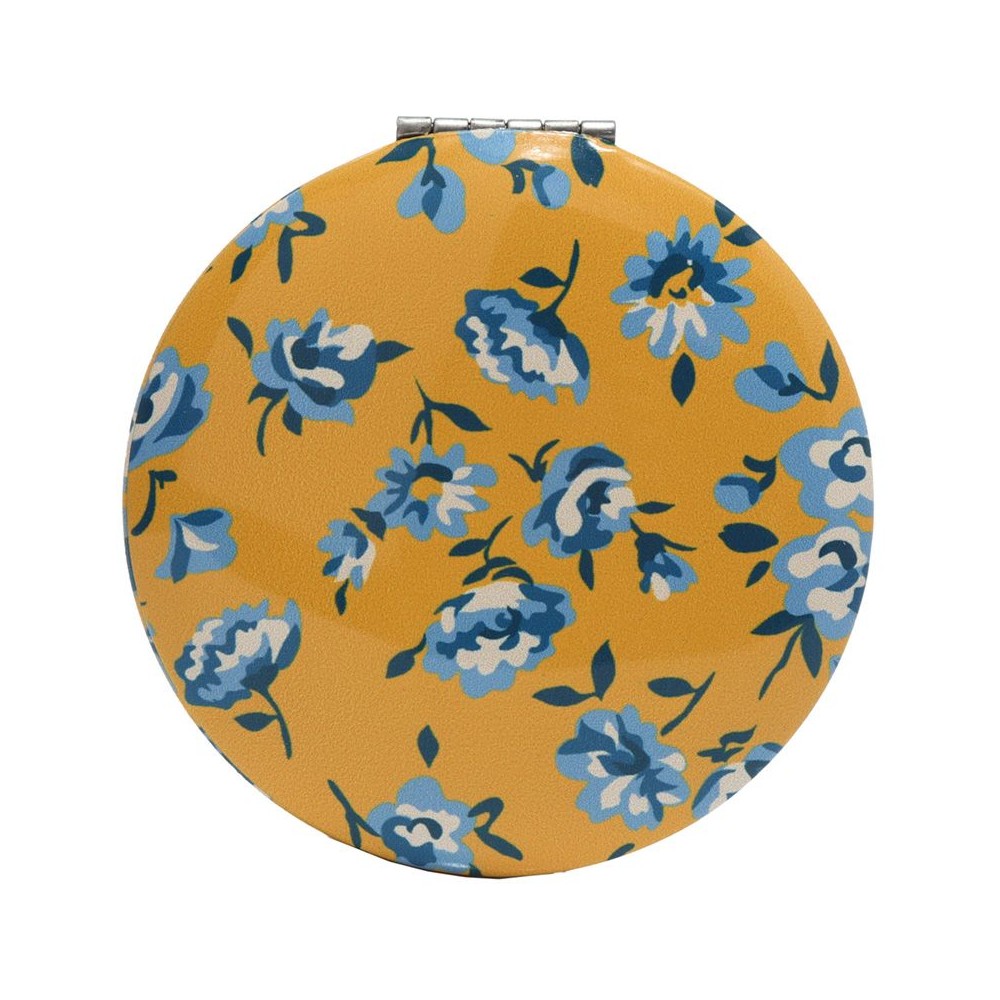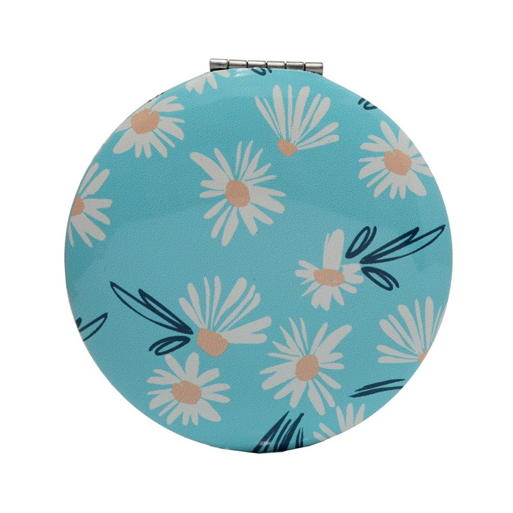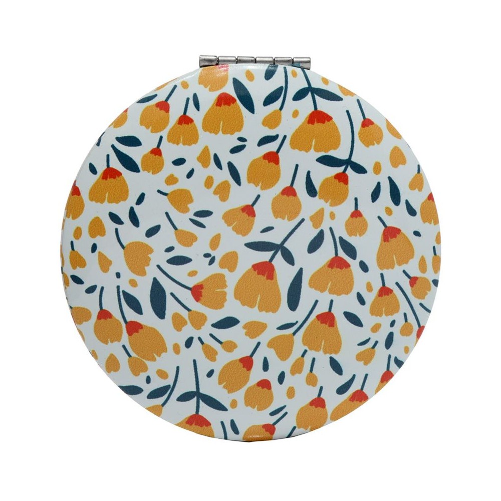 Espejo para bolso con doble cara fabricado en metal forrado de cuero sintético, diseño redondo, compacto y resistente con un bonito estampado de flores. El formato redondo permite un visión general de la cara, muy práctico para retocarse el maquillaje y depilarse.
