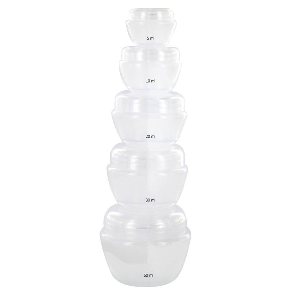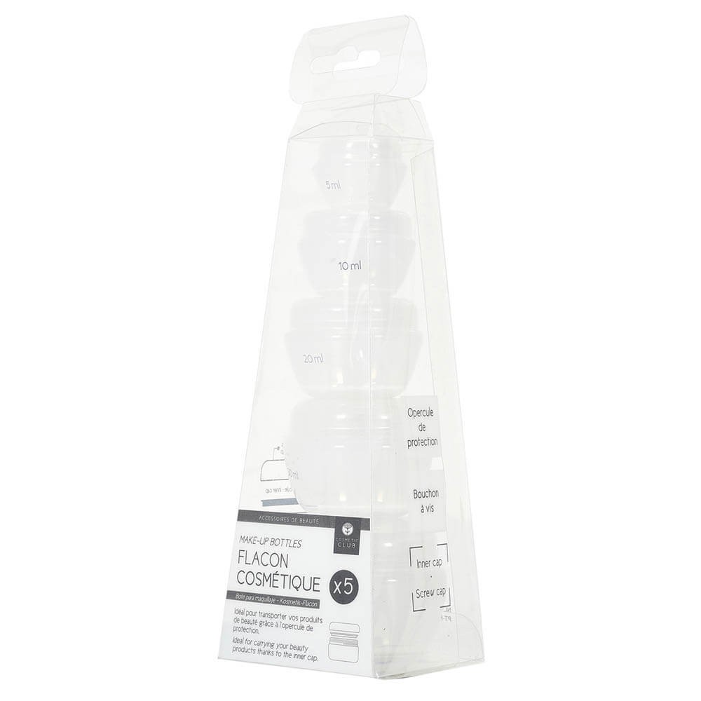 Conjunto de 5 botes de plástico de diferentes capacidades con tapa de rosca y tapa protectora, perfectos para llevar maquillaje y cremas en viajes.