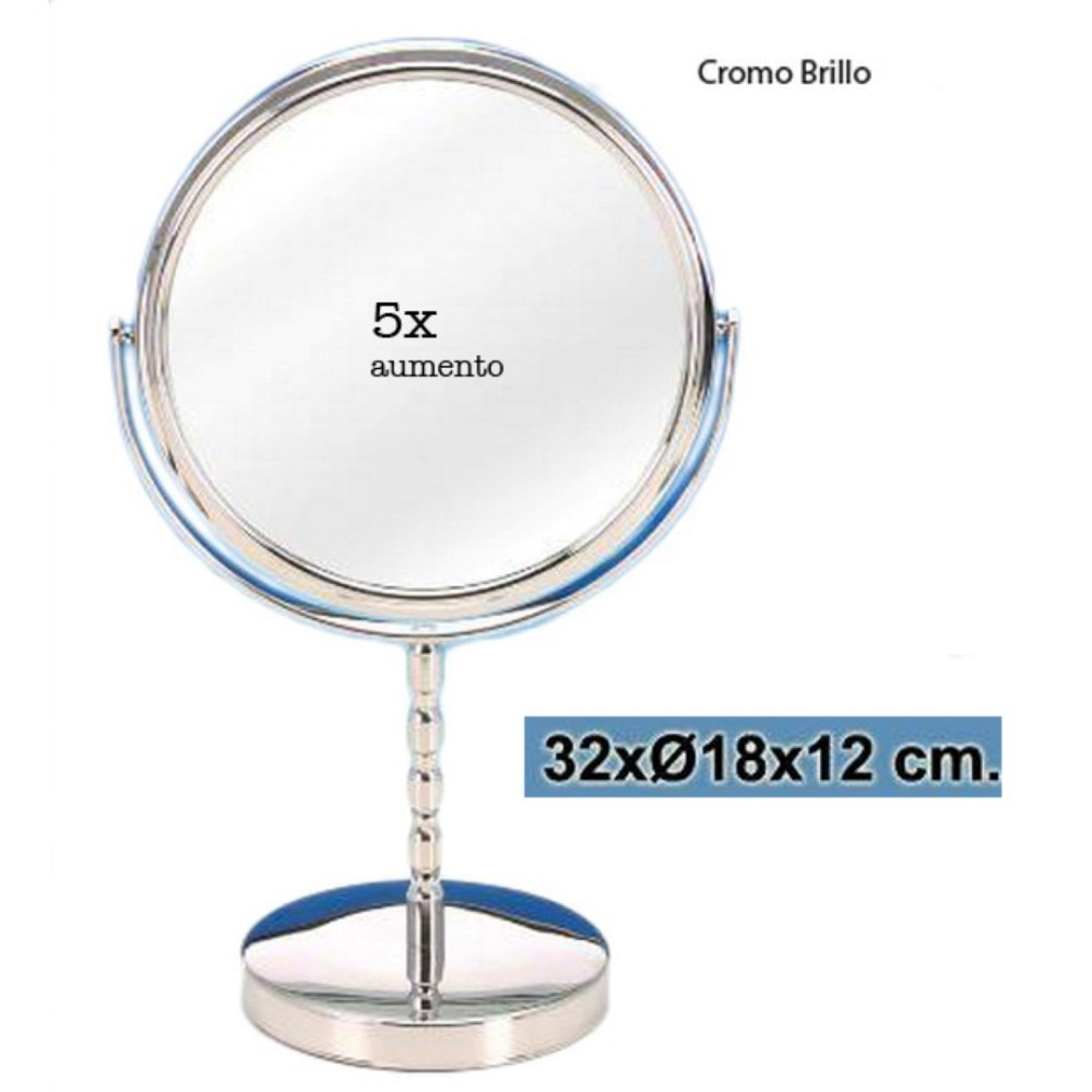 Espejo de aumento para encimera con base estable, fabricado en metal cromado acabado brillo con doble espejo, uno normal y otro con 5 aumentos. La forma redonda favorece la visión de la cara, convirtiéndolo en un espejo de aumento para maquillaje perfecto, también es muy útil para depilarse. Gracias a su aumento verás tu cara ampliada y te será mucho más fácil realizar esas funciones y muchas otras.