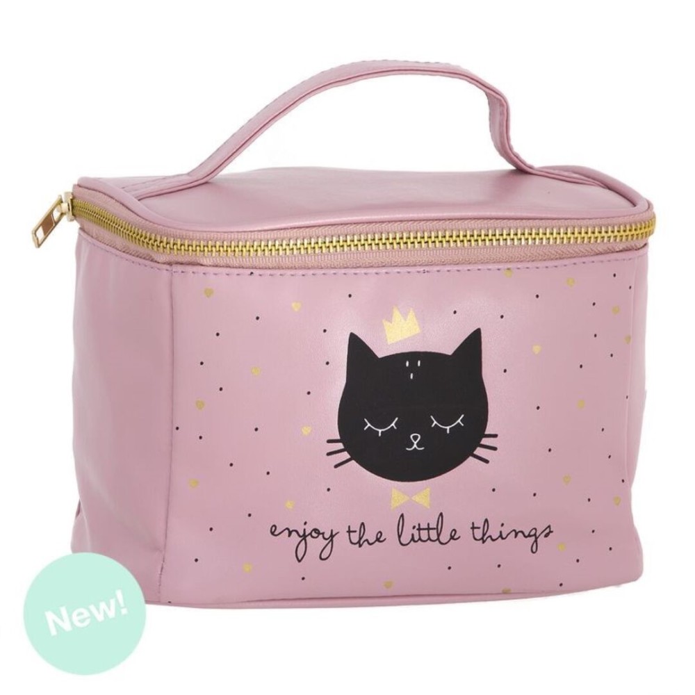 Bonito neceser cuadrado de polipiel con asa "enjoy the little things" pertenece a la colección CAT LOVER con más productos a juego cajas, marcos de fotos, cajas de te, neceseres, libretas, tazas, tazas de te, posavasos...