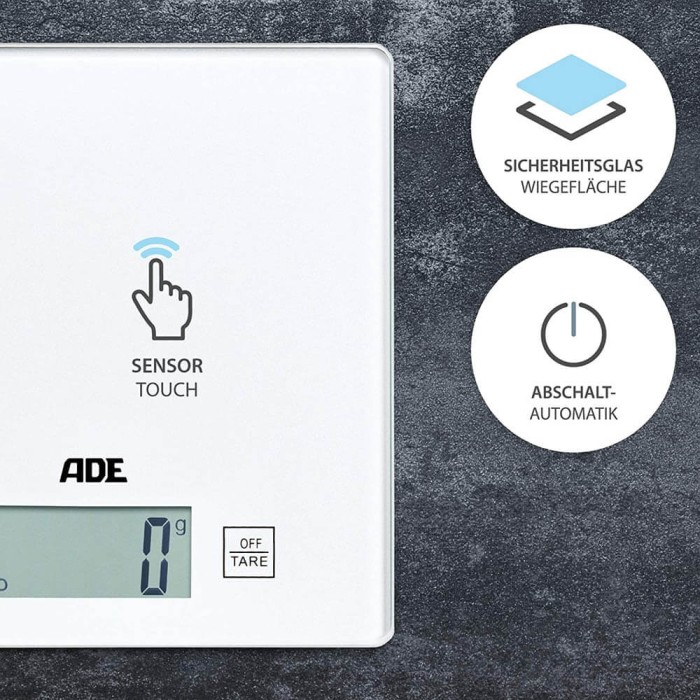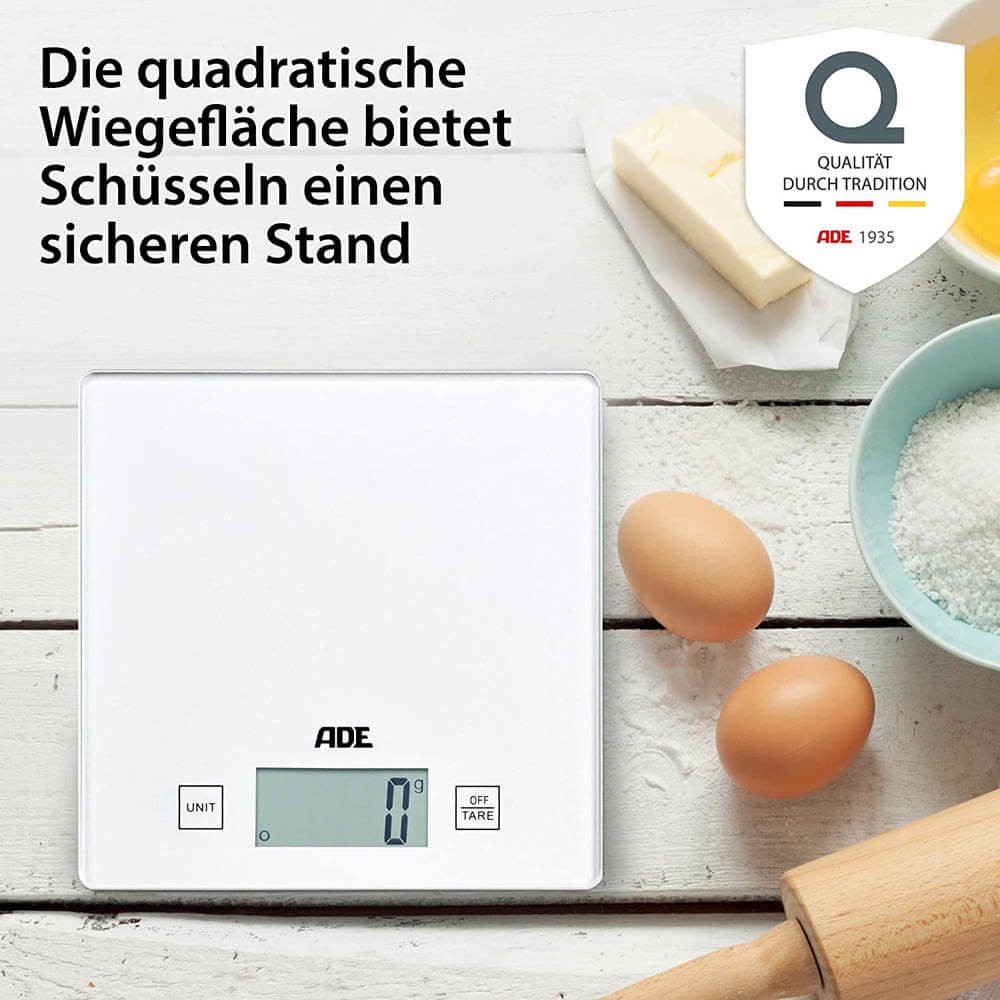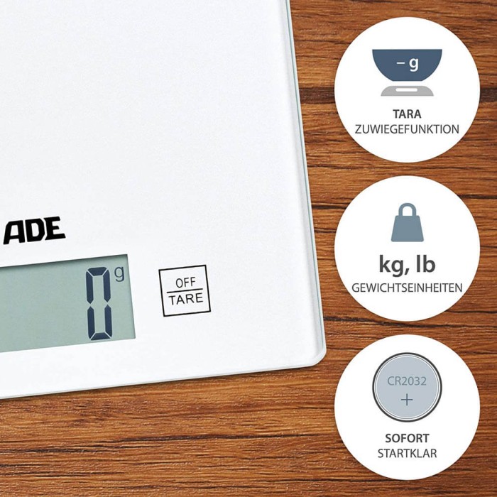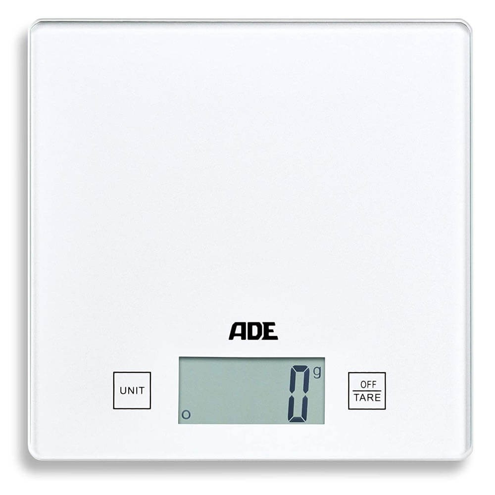 Bascula de cocina digital de la marca ADE modelo TINA en color blanco con funciones inteligentes y un diseño extraordinario, diseñada para pesar alimentos y objetos que no rebasen los 5 kilos, perfecta para uso diario en el hogar.
