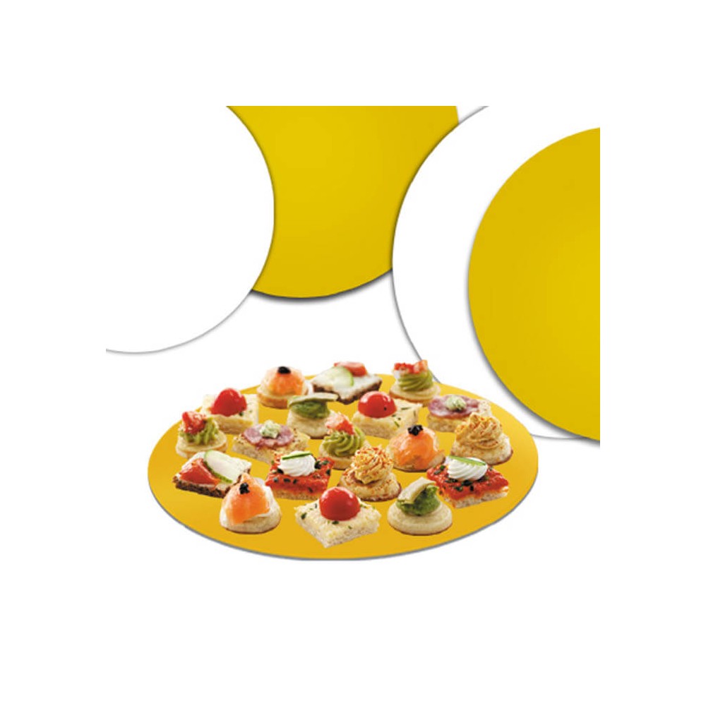 Base para repostería realizada en cartulina de 27 cm de diámetro con doble cara, dorada y blanca. Una base para tartas y alimentos perfecta como plato para presentaciones. La base es versátil en la presentación, cambiando el lado cambiara el color que se muestra.