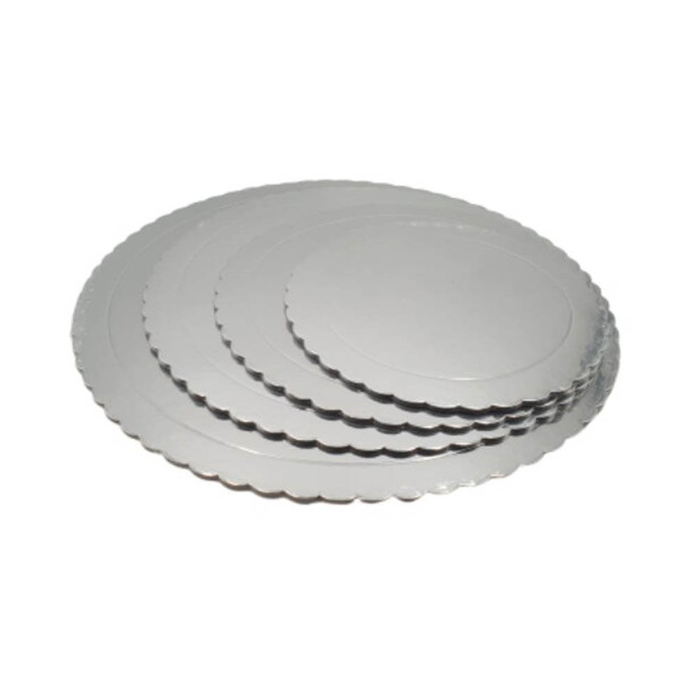 Base para tarta realizada en cartón de color plata con los bordes ondulados, ideal para que puedas transportar cómodamente una tarta a la vez que le das un acabado profesional.