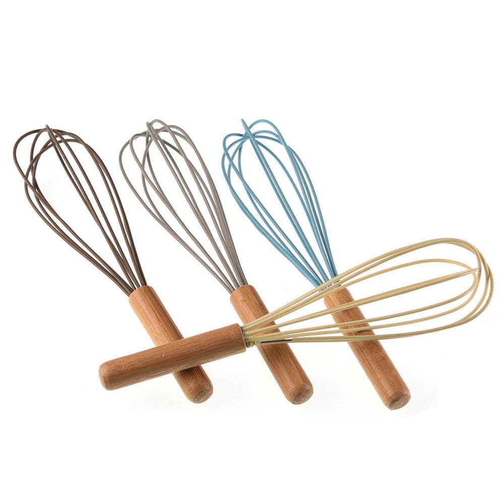 Práctico batidor de cocina manual con varillas de silicona y mango de bambú para que remuevas, batas y mezcles los alimentos sin rayar tus baterías de cocina.