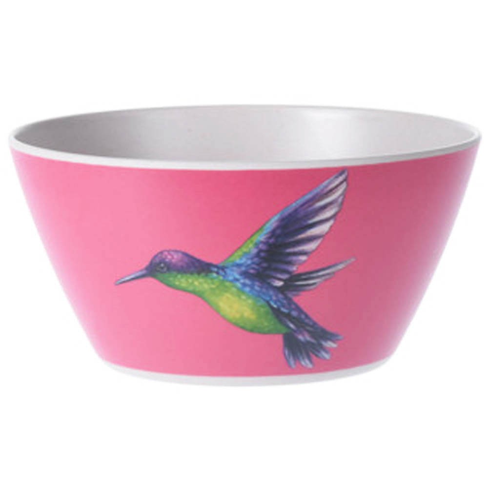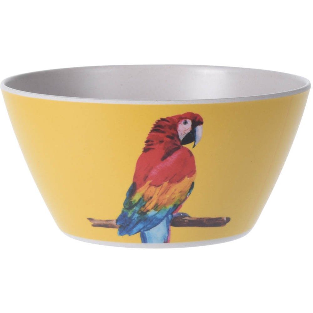 Un bol para aperitivos con un llamativo diseño de aves tropicales sobre fondo de color sólido acabado mate. 4 modelos surtidos según disponibilidad, Tucan, Flamenco, Colibrí o Loro.