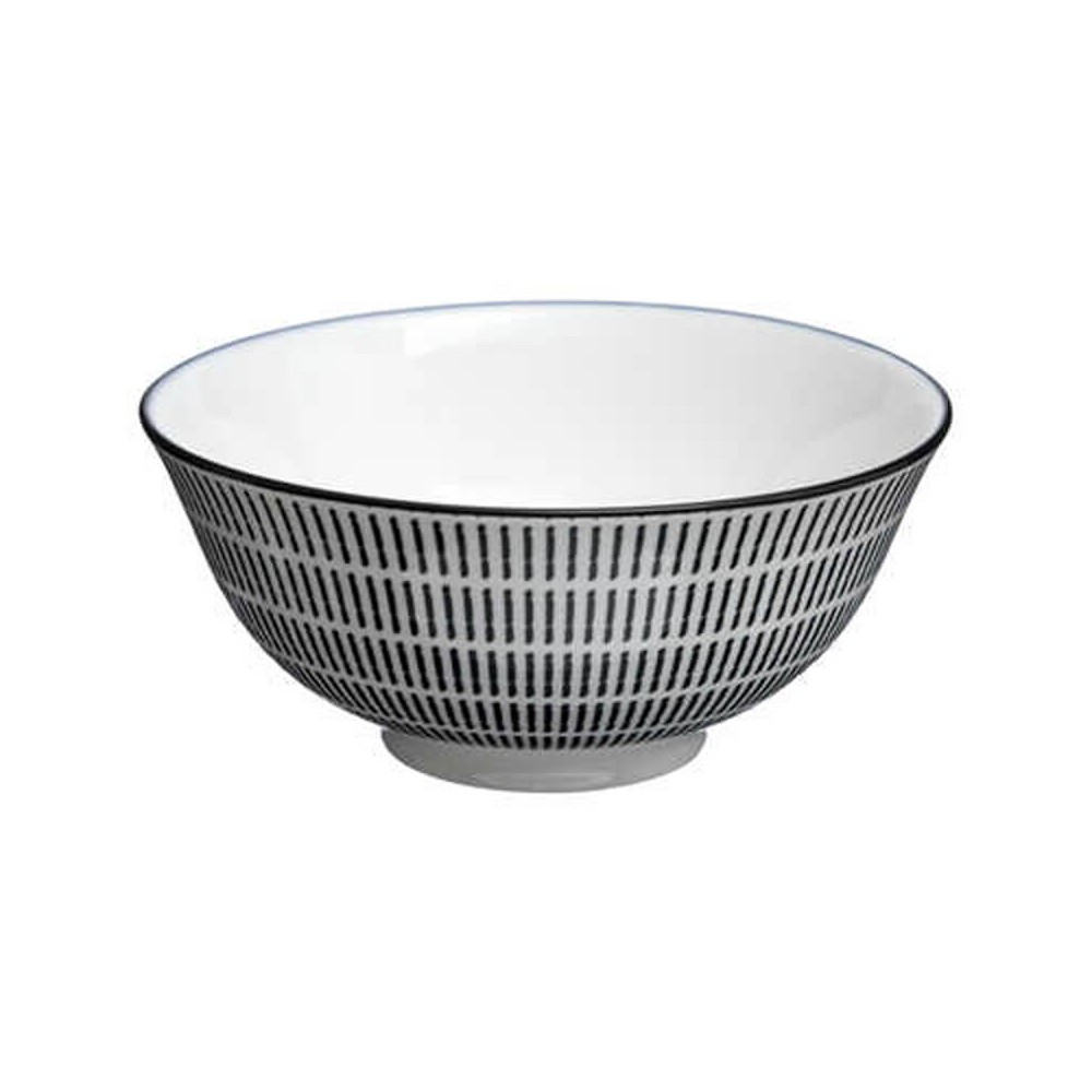 Bowl de porcelana de 15 cm de diámetro con un bonito diseño de estilo oriental, lleva el interior liso blanco y el exterior decorado con un patrón de líneas negras con el filo negro, ideal para servir aperitivos, caldos y ensaladas.