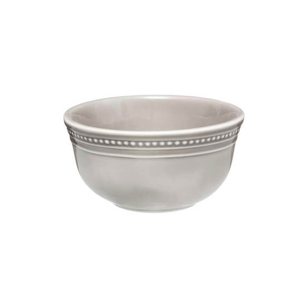 Bowl de cerámica de 18 cm de diámetro con un bonito diseño de estilo clásico en color gris, lleva el interior liso y el exterior decorado con una cenefa de bolitas en relieve, ideal como bowl de desayuno.