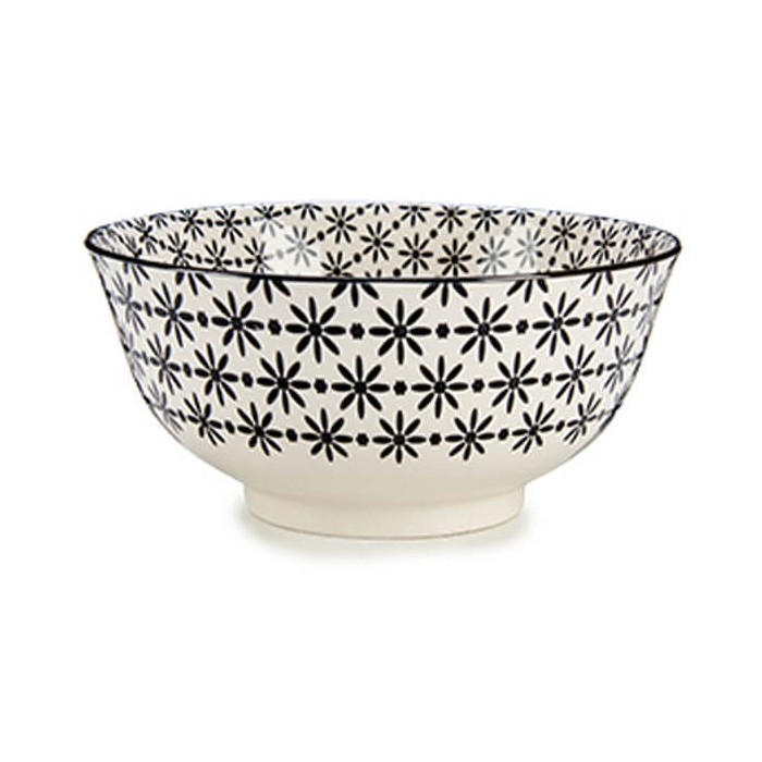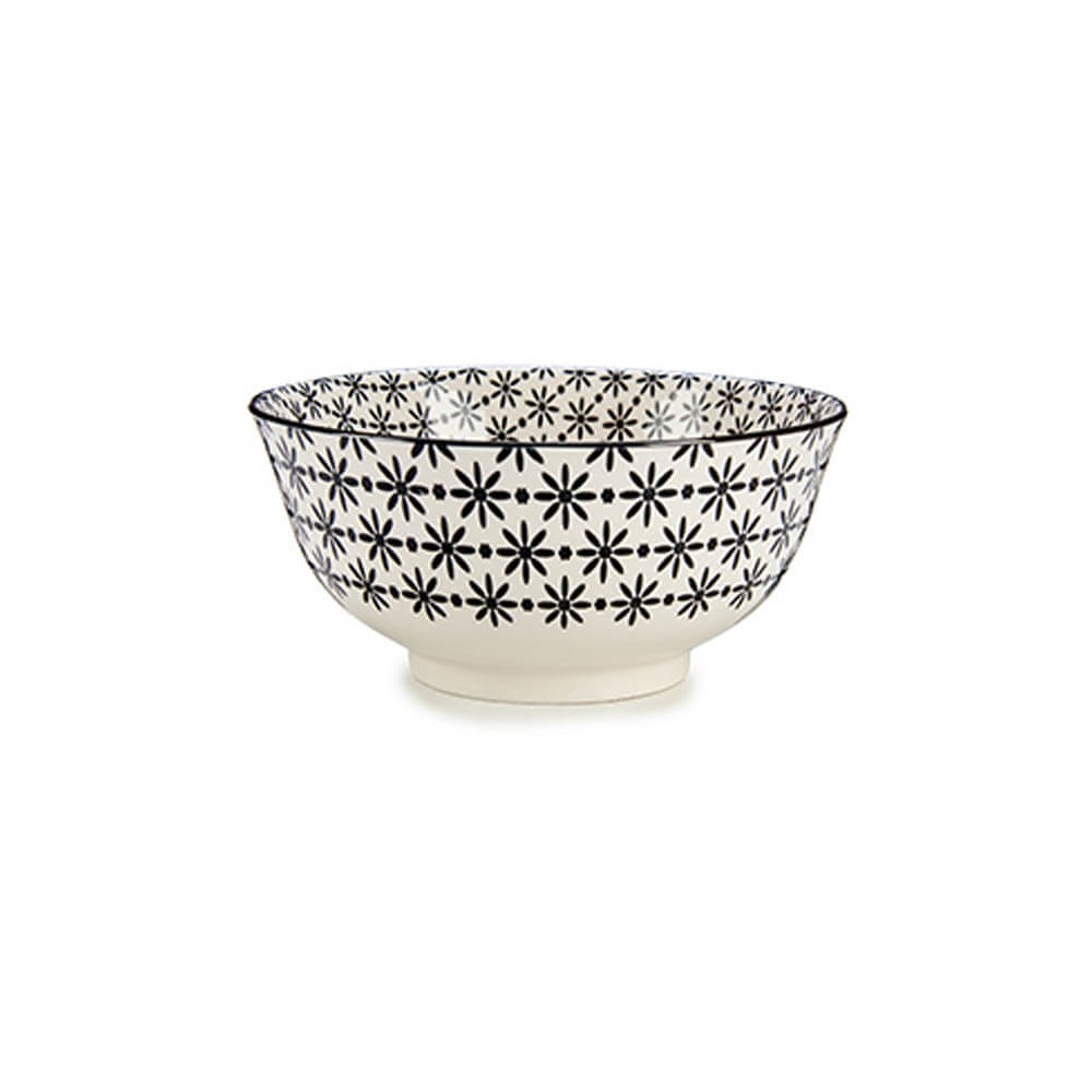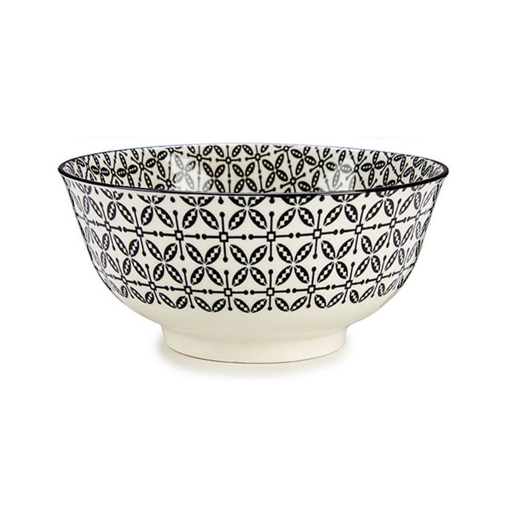 Bowl de porcelana de 18 cm de diámetro decorado con dibujos de inspiración oriental en blanco y negro, perfecto para servir snacks, aperitivos, caldos y ensaladas en la mesa.