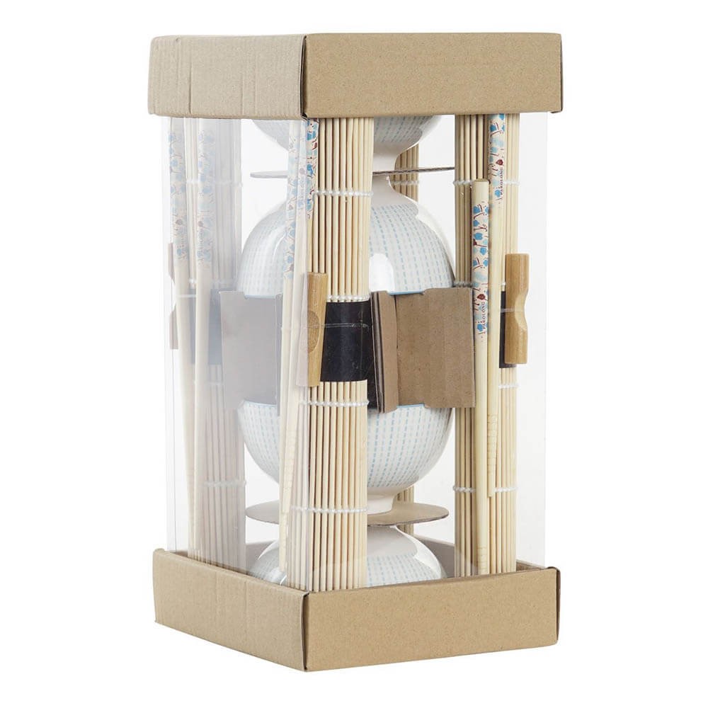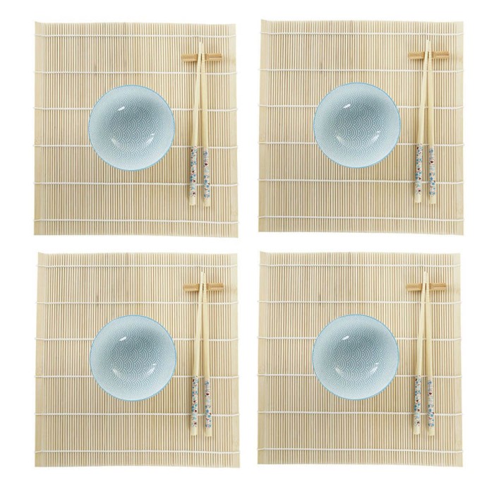 El set de 16 piezas incluye 4 individuales, 4 cuencos, 4 pares de palillos y 4 soportes para palillos.