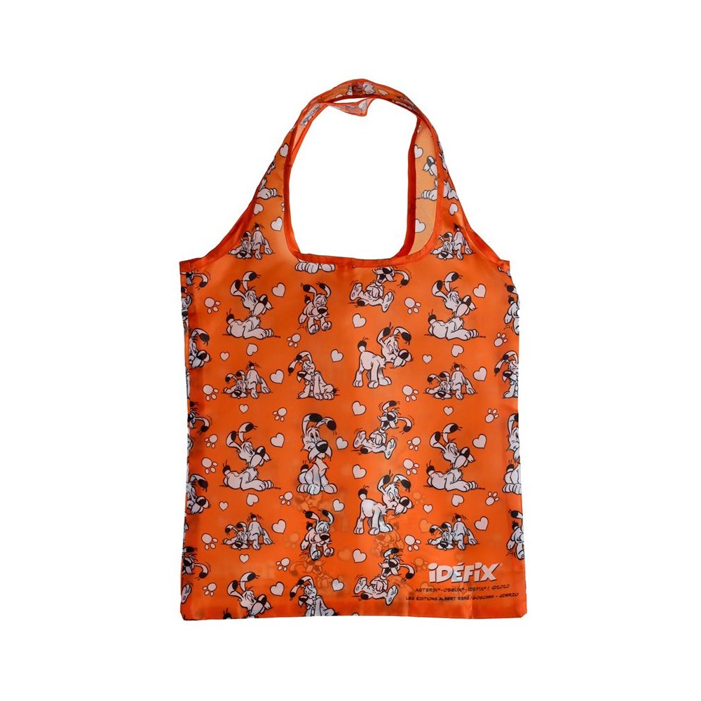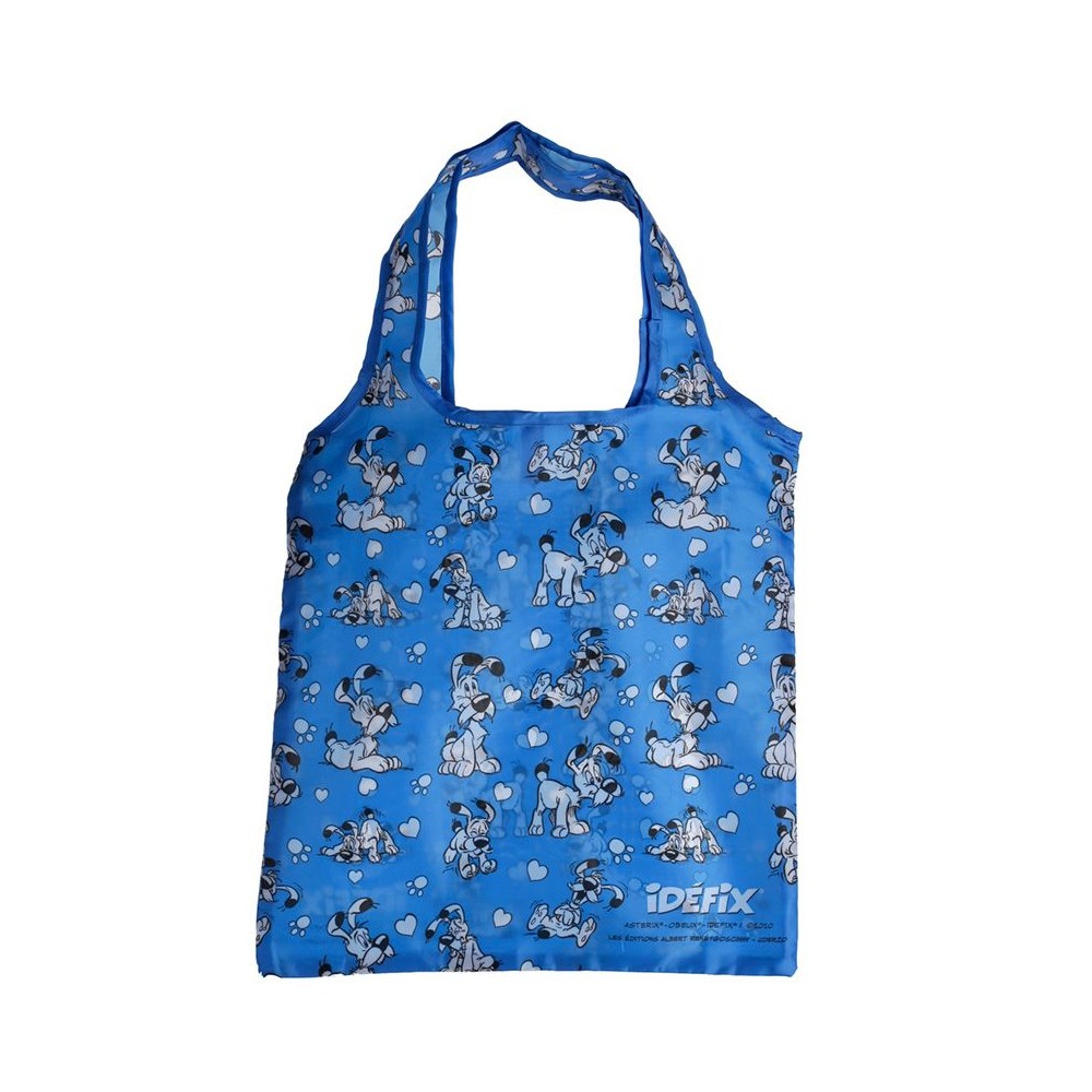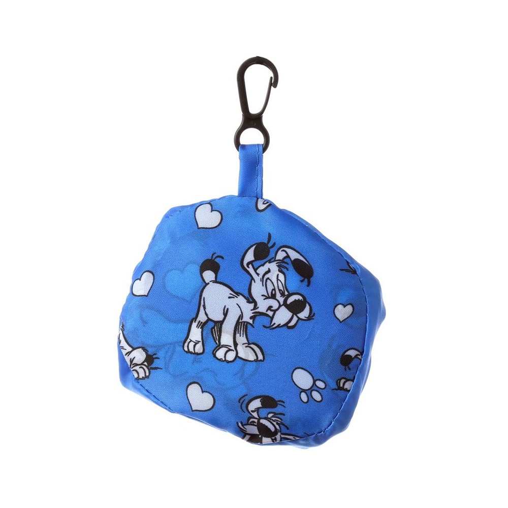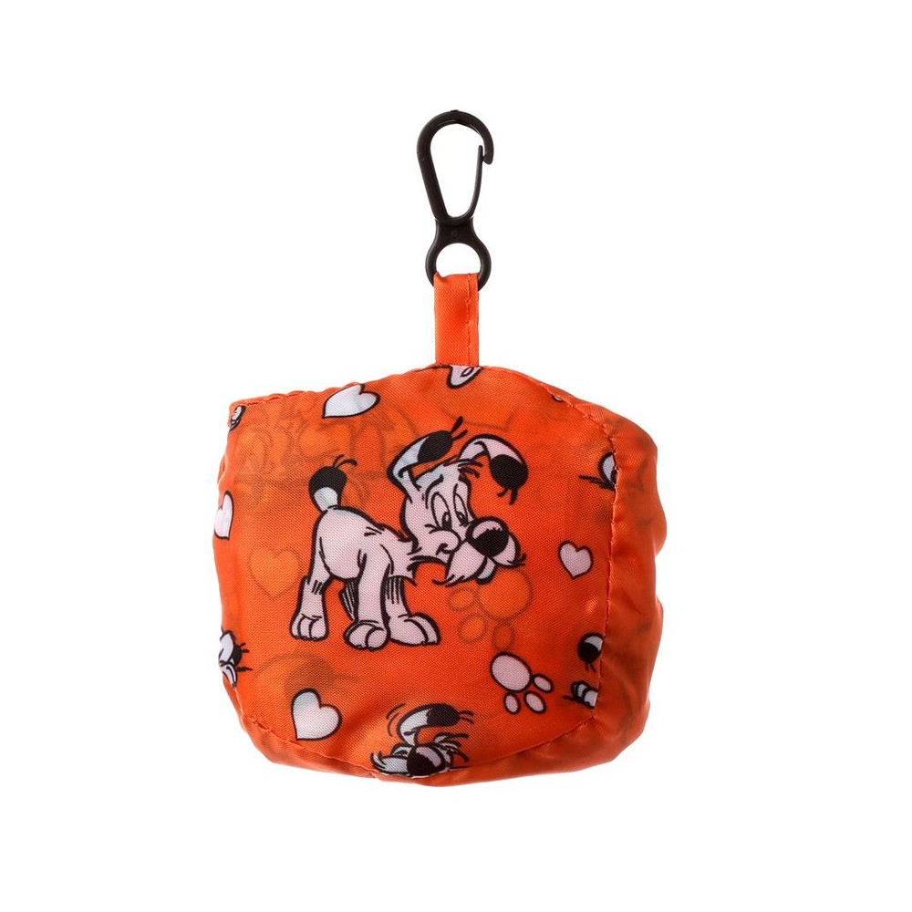 La bolsa para compra esta disponible en color azul o naranja con un original estampado con el perrito de Asterix, Ideafix, en diferentes posiciones. Incluye una bolsita a juego con un práctico mosquetón.