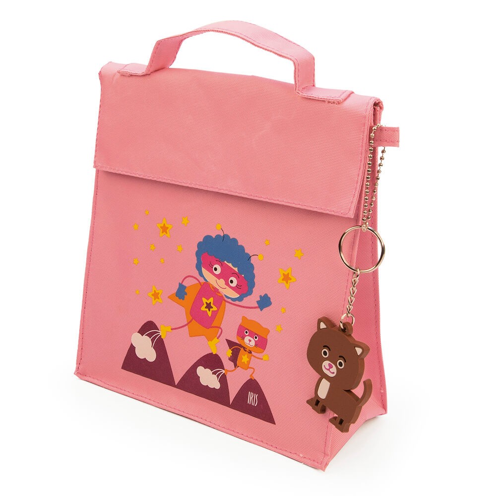 Bolsa térmica infantil de la marca Iris diseño súper heroína, realizada en poliéster de color rosa con el interior forrado de material térmico libre de BPA, perfecta para que los niños lleven la merienda.