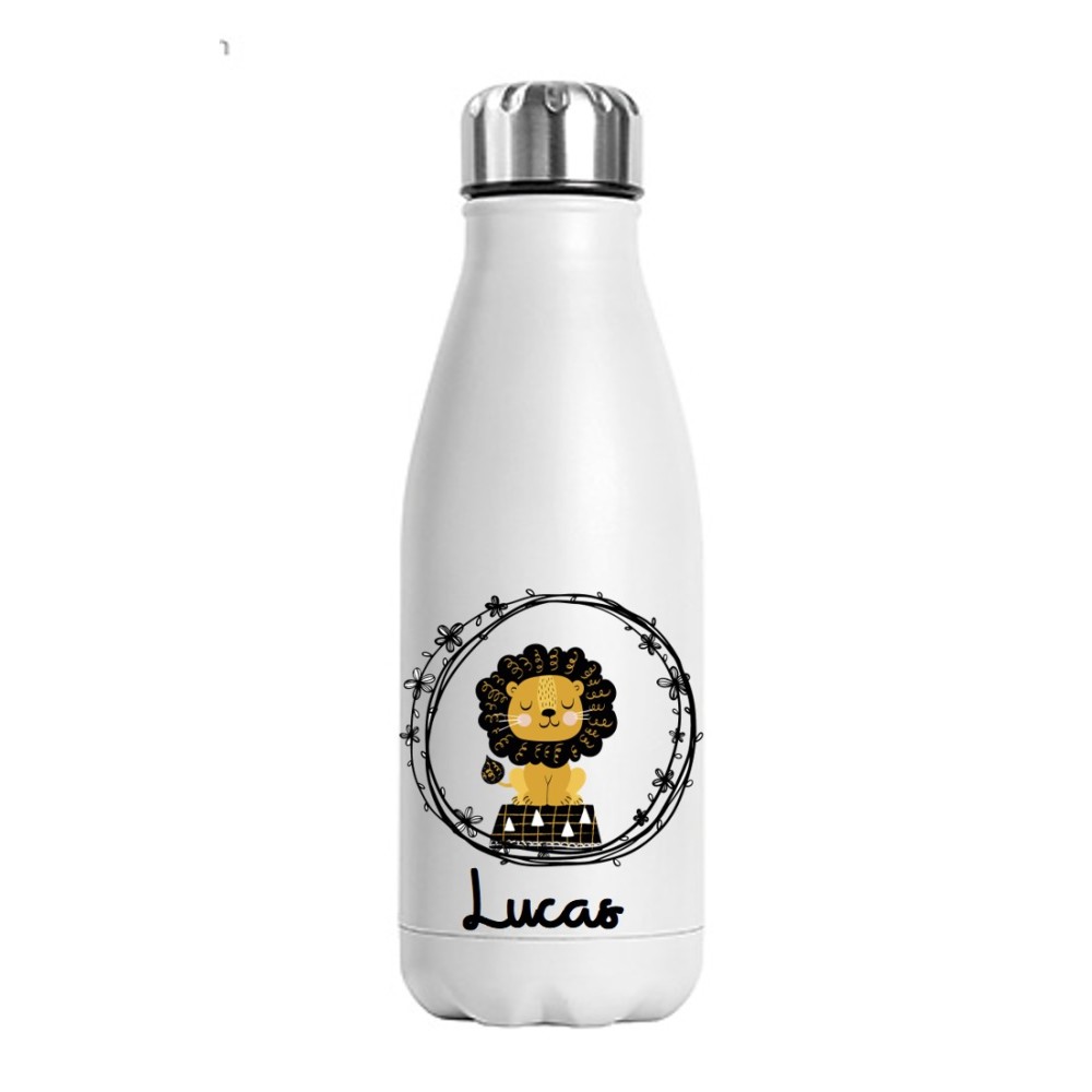 El recubrimiento blanco permite estampaciones de patrones, diseños y mensajes únicos, convirtiéndola en un regalo perfecto para cualquier ocasión. Añade el nombre de tu hijo o el que quieras para hacerla única y especial, nosotros lo adaptaremos a la botella para que quede perfecto debajo del simpático león.