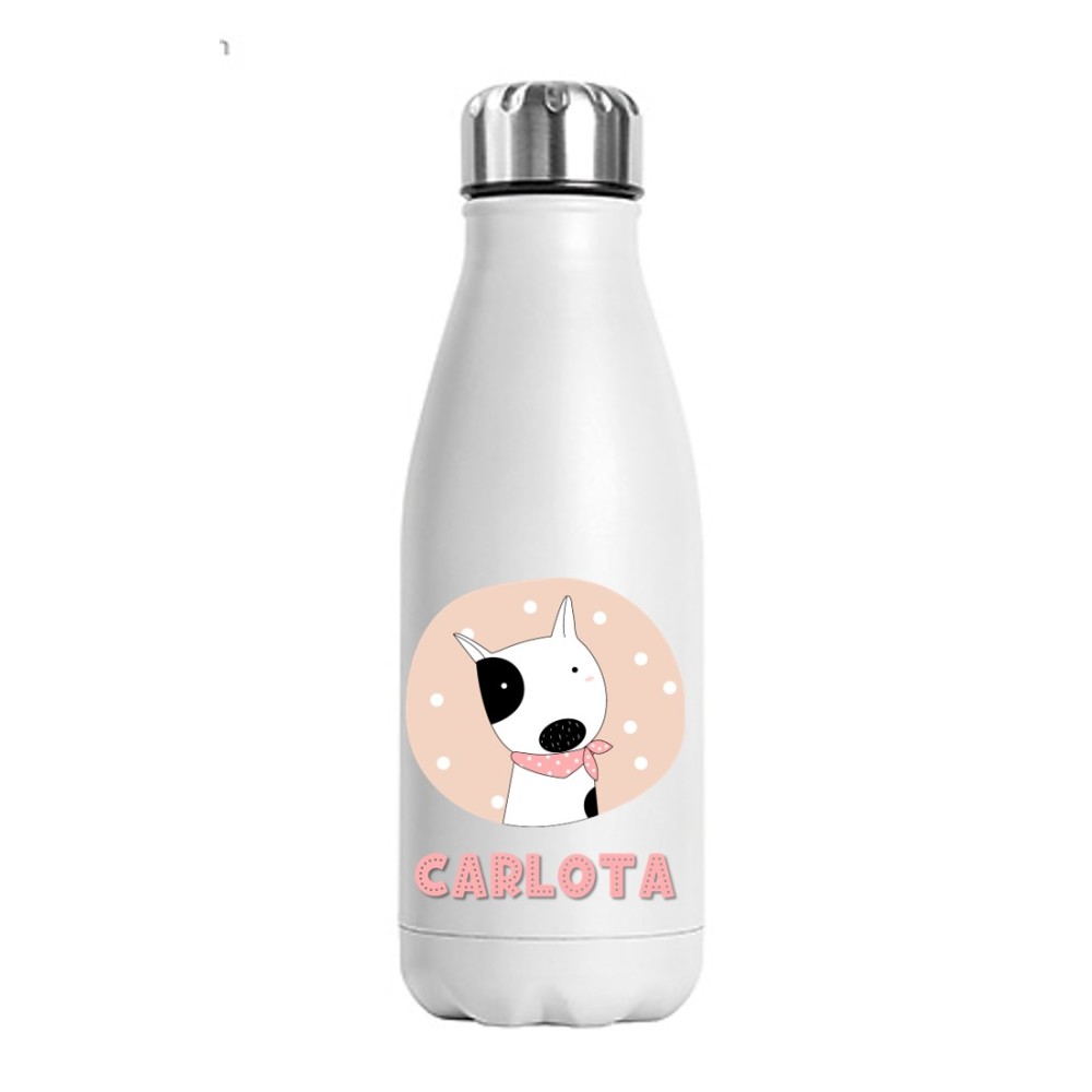 El recubrimiento blanco permite estampaciones de patrones, diseños y mensajes únicos, convirtiéndola en un regalo perfecto para cualquier ocasión. Añade el nombre de tu hija o el que quieras para hacerla única y especial, nosotros lo adaptaremos a la botella para que quede perfecto debajo del adorable perrito.