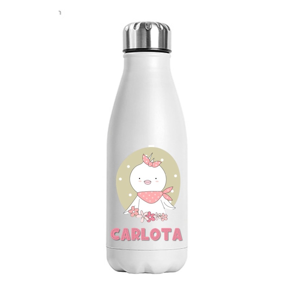 El recubrimiento blanco permite estampaciones de patrones, diseños y mensajes únicos, convirtiéndola en un regalo perfecto para cualquier ocasión. Añade el nombre de tu hija o el que quieras para hacerla única y especial, nosotros lo adaptaremos a la botella para que quede perfecto debajo del adorable pollito.