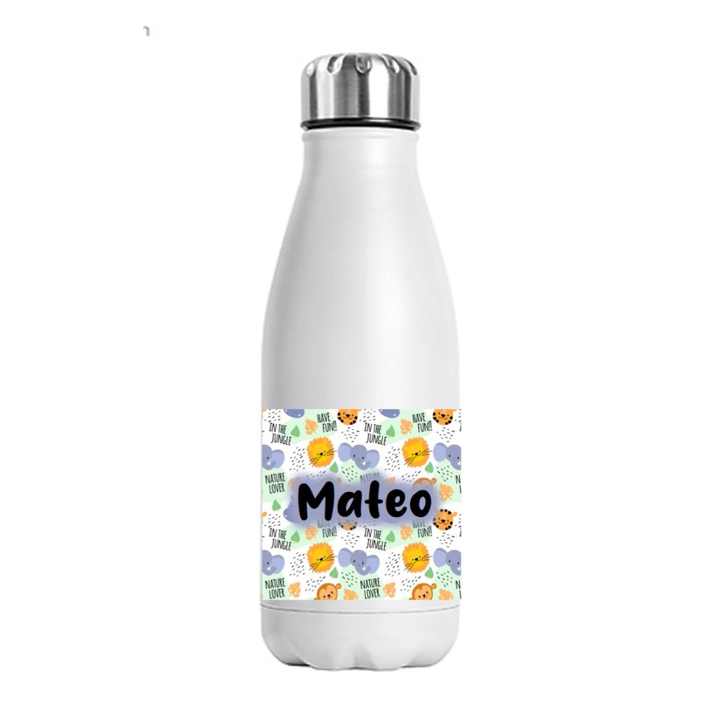El recubrimiento blanco permite estampaciones de patrones, diseños y mensajes únicos, convirtiéndola en un regalo perfecto para cualquier ocasión. Añade el nombre de tu hijo o el que quieras para hacerla única y especial, nosotros lo adaptaremos a la botella para que quede perfecto entre los divertidos dibujos de animales de la jungla.