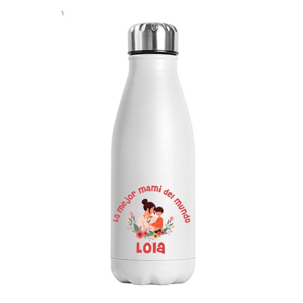 El recubrimiento blanco permite estampaciones de patrones, diseños y mensajes únicos, convirtiéndola en un regalo perfecto para cualquier ocasión. Añade al mensaje frontal de la botella térmica "La mejor mami del mundo" el nombre de tu madre para hacerla única y especial. Verás la ilusión que le hace recibir un regalo personalizado con su nombre al que además sacara muchísimo partido, perfecta para llevarla al trabajo, gimnasio, actividades al aire libre, etc.