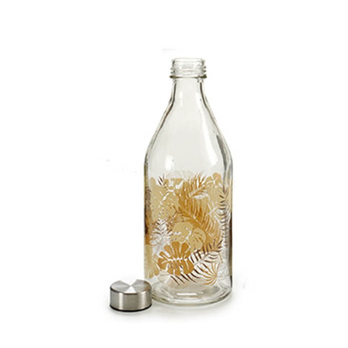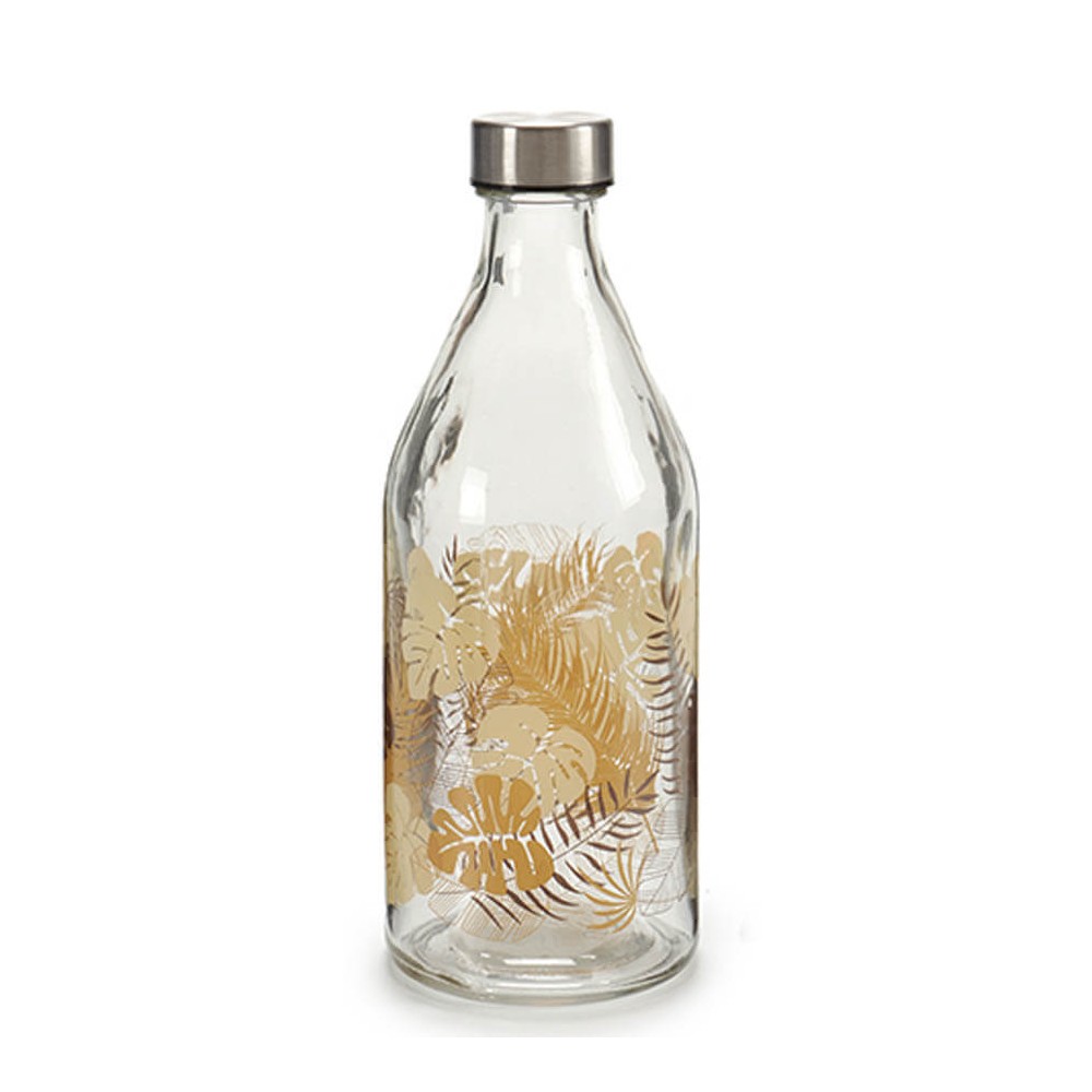 Botella de cristal reutilizable decorada con hojas tropicales en tonos marrones. La botella de agua se cierra a rosca con un tapón metálico, su tamaño es idóneo para la puerta de la nevera, es muy práctica para guardar todo tipo de líquidos, agua, leche, zumo, etc.