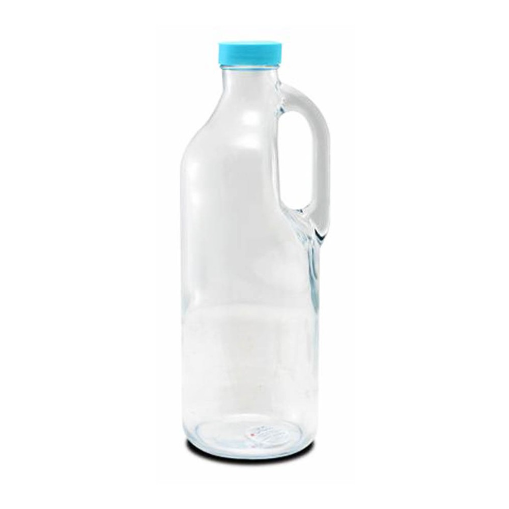 Botella de agua realizada en cristal transparente con asa y tapón con cierre de rosca azul.