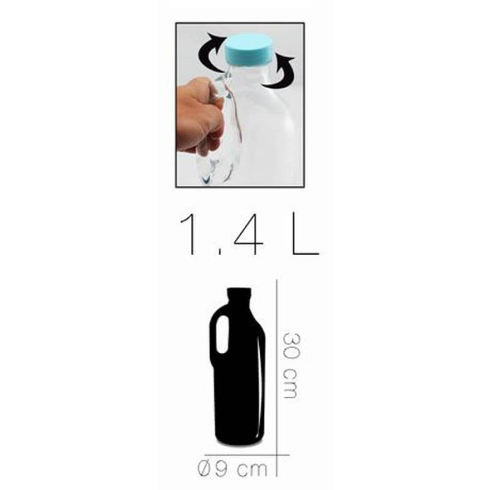 La botella de cristal tiene capacidad para 1,4 litros, es muy practica para tener siempre agua fría, también se puede usar para rellenar con otros líquidos, zumos, leche, batidos, etc.