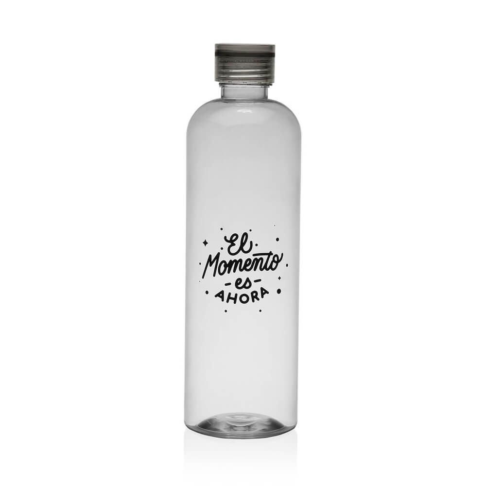 Botella de plástico poliestireno de 1,5L, libre de BPA, con la frase "El momento es ahora". Diseño en color humo, resistente y fácil de transportar. Medidas: 29 x 9 x 9 cm.